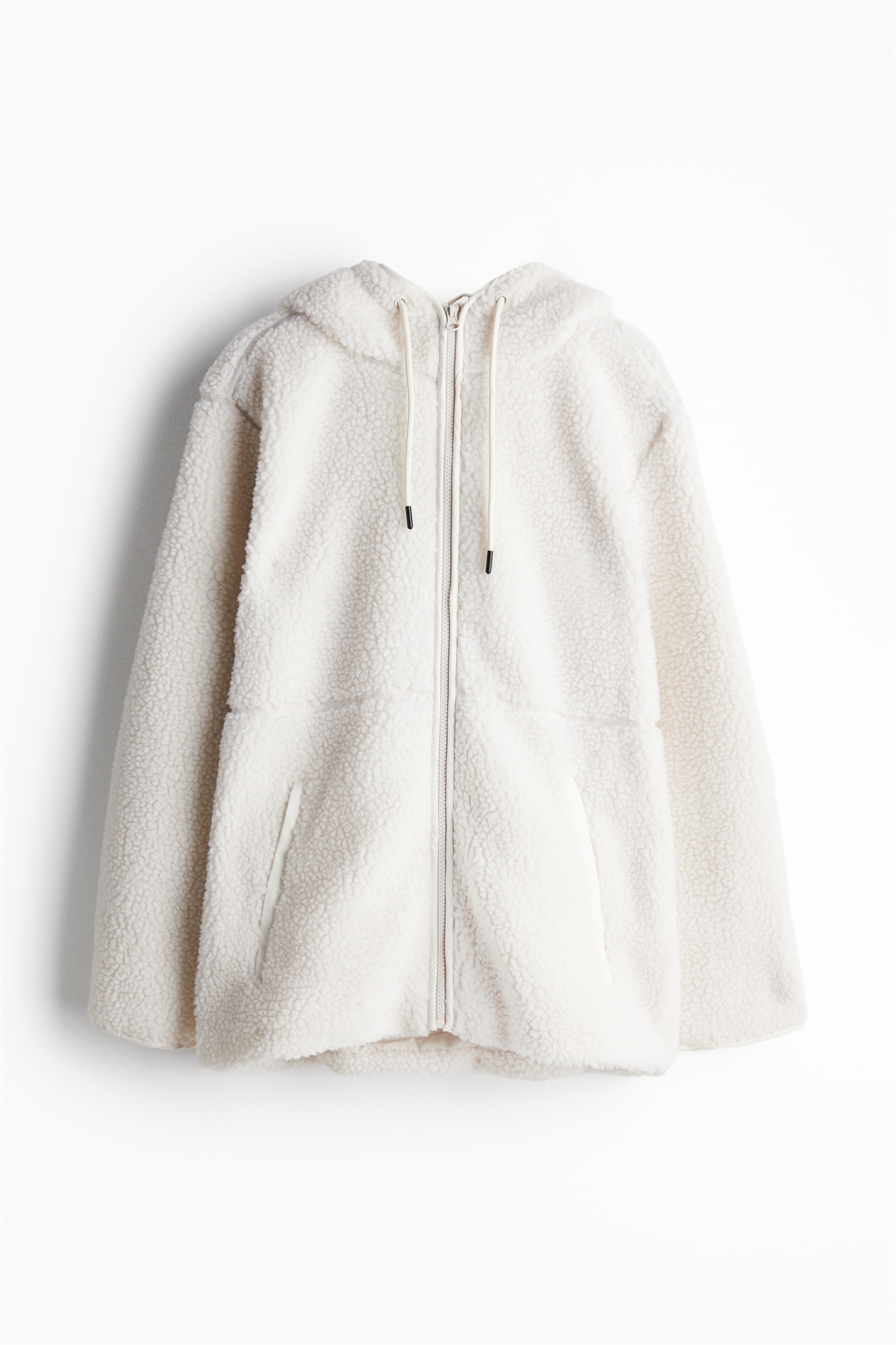 Куртка из мягкого плюша с капюшоном на завязках, застежкой-молнией спереди и боковыми карманами на молнии. На подкладке.