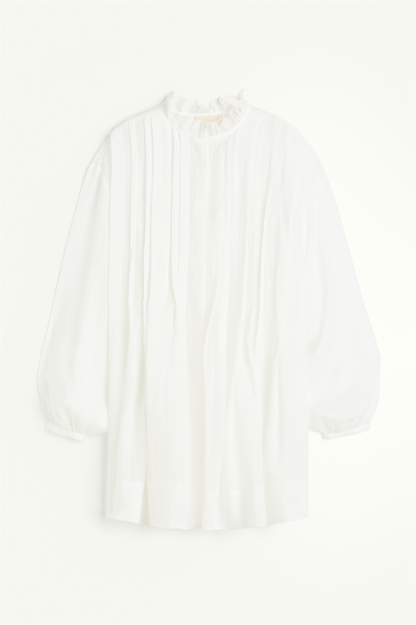 Короткое платье из воздушной ткани рами с пинтами спереди и сзади, воротником с оборками и потайными пуговицами спереди. Слегка спущенные плечи и длинные рукава-баллон с узкими манжетами на пуговицах. Нижнее платье из вискозы с узкими регулируемыми бретелями.