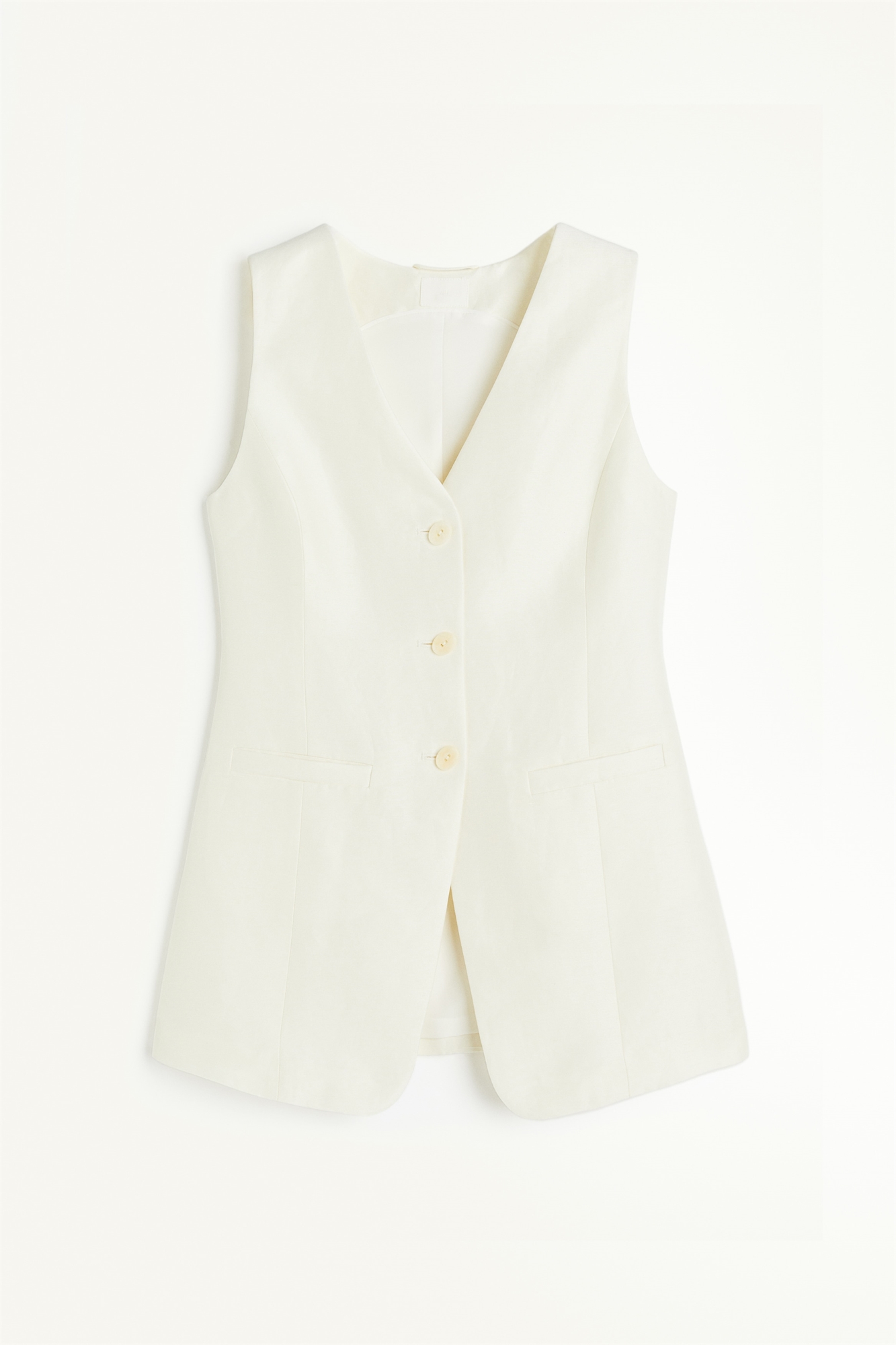 Приталенный жилет из смеси льна и вискозы с воздушным плетением. V-образный вырез, перламутровые пуговицы спереди, прорезные передние карманы и один задний вентиляционный проем. На подкладке.
