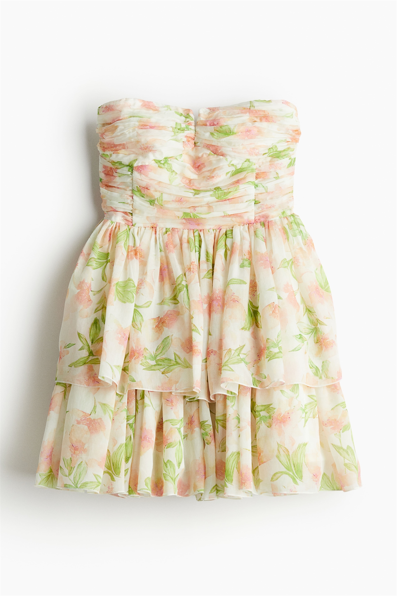 Короткое приталенное платье-бандо из тканого материала с приталенным лифом с вырезом в форме сердца, косточками спереди для придания формы и поддержки и потайной застежкой-молнией сзади. Расклешенная юбка в два слоя. На подкладке.