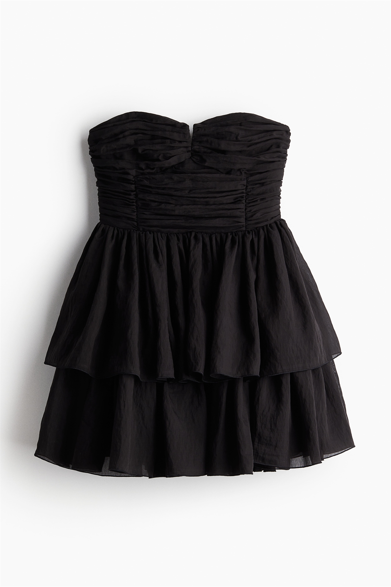 Короткое приталенное платье-бандо из тканого материала с приталенным лифом с вырезом в форме сердца, косточками спереди для придания формы и поддержки и потайной застежкой-молнией сзади. Расклешенная юбка в два слоя. На подкладке.