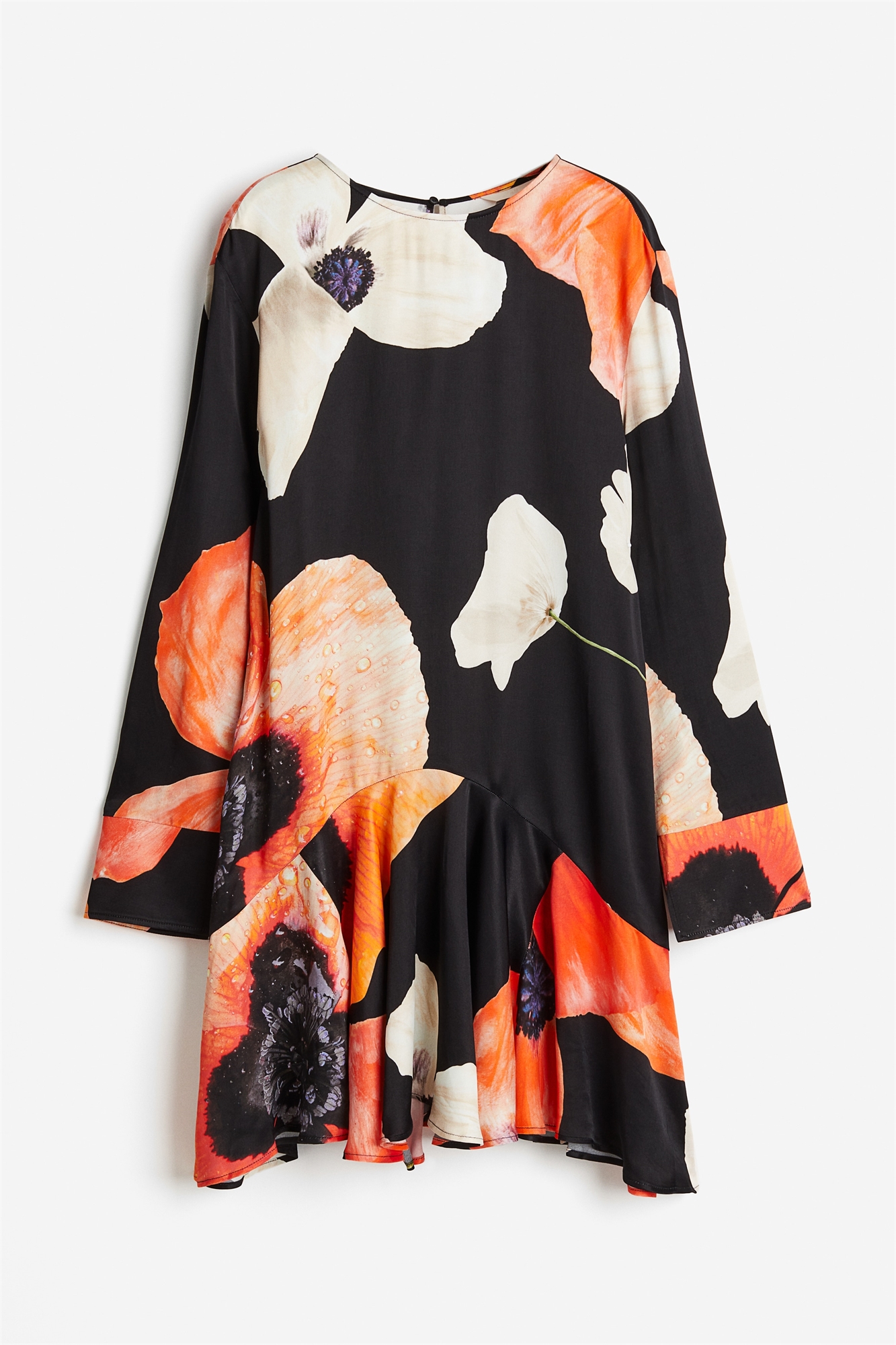 Короткое платье из мягко драпирующегося атласа с круглым вырезом и застежкой на потайную пуговицу сзади на шее. Спущенные плечи и длинные рукава с разрезом на манжетах. Потайная застежка-молния сзади и фигурный шов над подолом. Без подкладки.