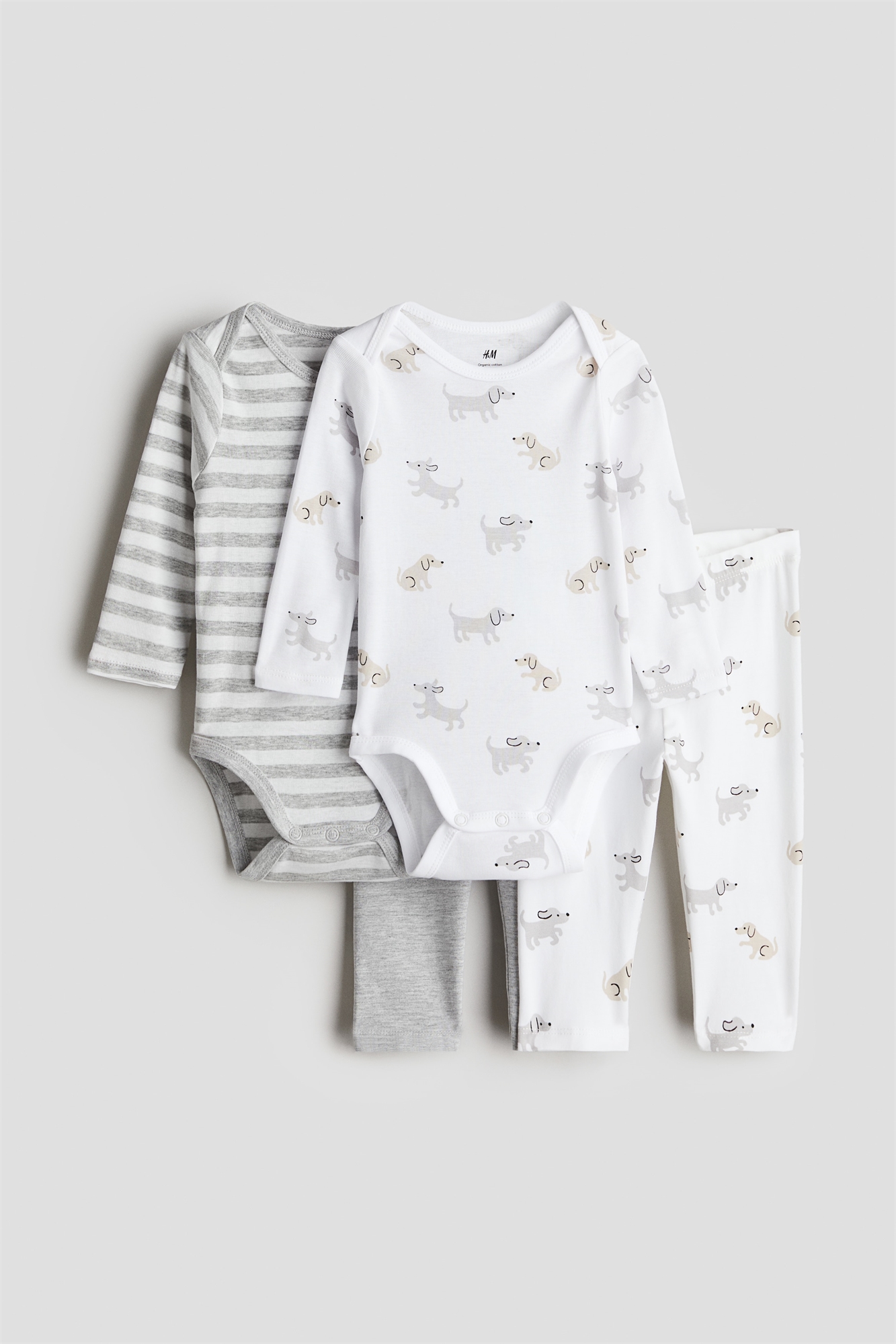 Комплект из двух боди и двух пар джоггеров из мягкого хлопкового джерси. Боди с длинными рукавами, горловиной-конвертом для плавного одевания и кнопками в промежности для удобства переодевания. Джоггеры с эластичной талией для комфортной посадки в области животика.