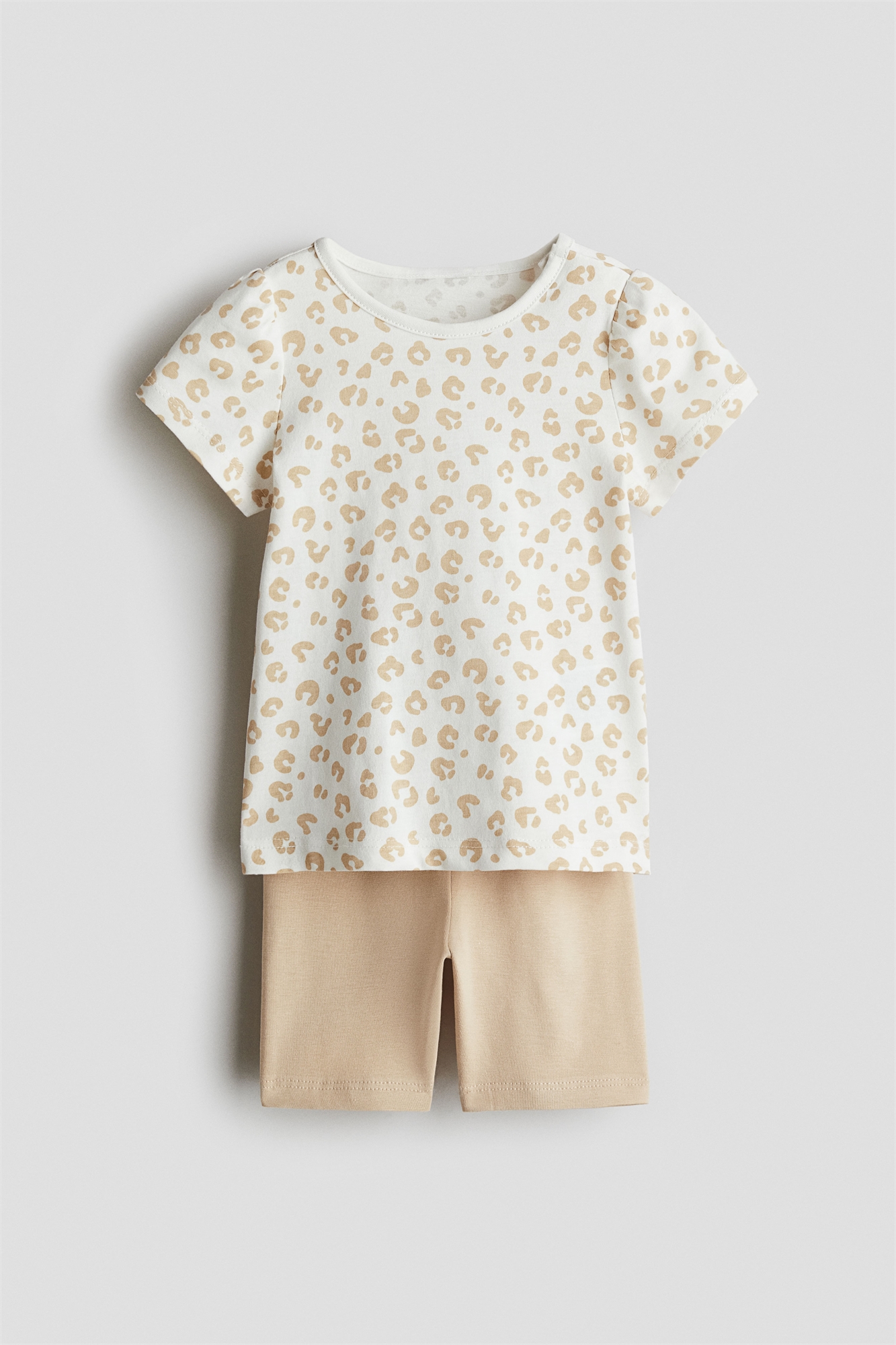 Комплект из топа и велошорт из мягкого хлопкового джерси. Топ с принтом по всей поверхности, круглым вырезом, кнопкой на одном плече (кроме размеров 2-4Y) и короткими рукавами со сборкой по плечевому шву. Велошорты с эластичной талией.