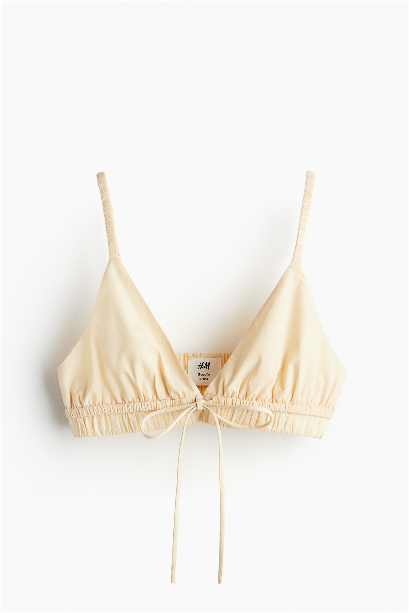 Коллекция Studio. Облегающий топ-бралетт из мягкого хлопкового полотна с V-образным вырезом горловины, узкими эластичными бретелями и открытой передней частью с застежками на пуговицы и петли. Аккуратная завязка с узлом над подолом, которая завязывается спереди. Эластичная лента на подоле, расширяющаяся сзади для плотного прилегания. На подкладке.
