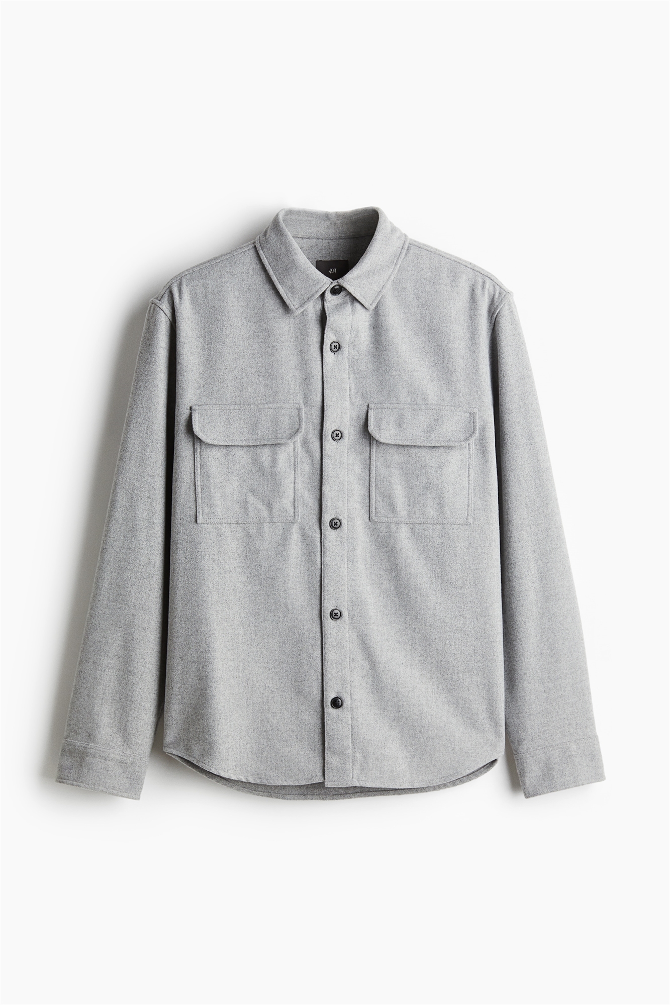 Рубашка из войлока с воротником, застежкой на пуговицы спереди, ярмом сзади, накладными нагрудными карманами, длинными рукавами и манжетами на пуговицах. Закругленный подол. Регулярный крой для комфортной носки и классического силуэта.
