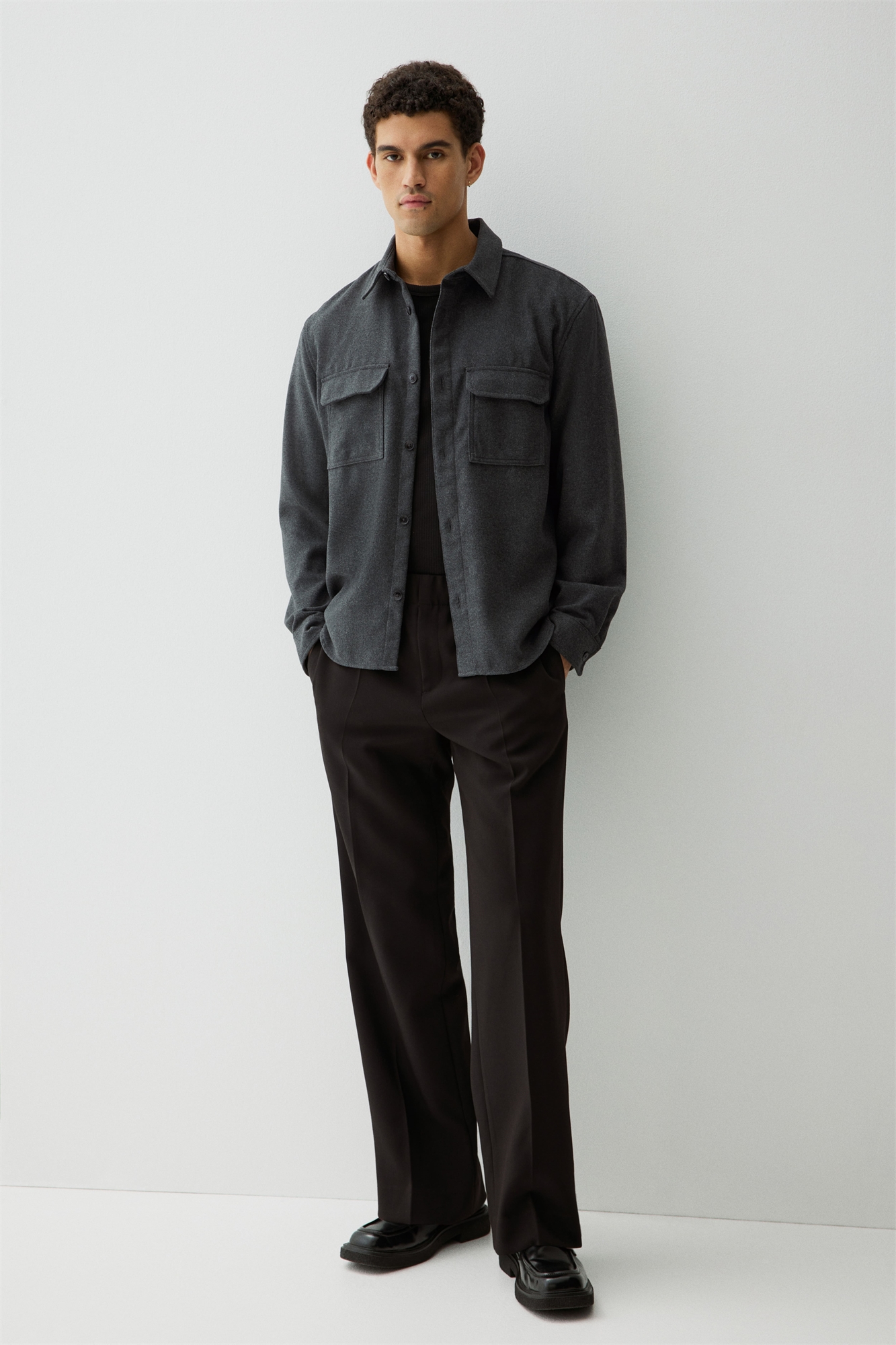 Рубашка из войлока с воротником, застежкой на пуговицы спереди, ярмом сзади, накладными нагрудными карманами, длинными рукавами и манжетами на пуговицах. Закругленный подол. Регулярный крой для комфортной носки и классического силуэта.