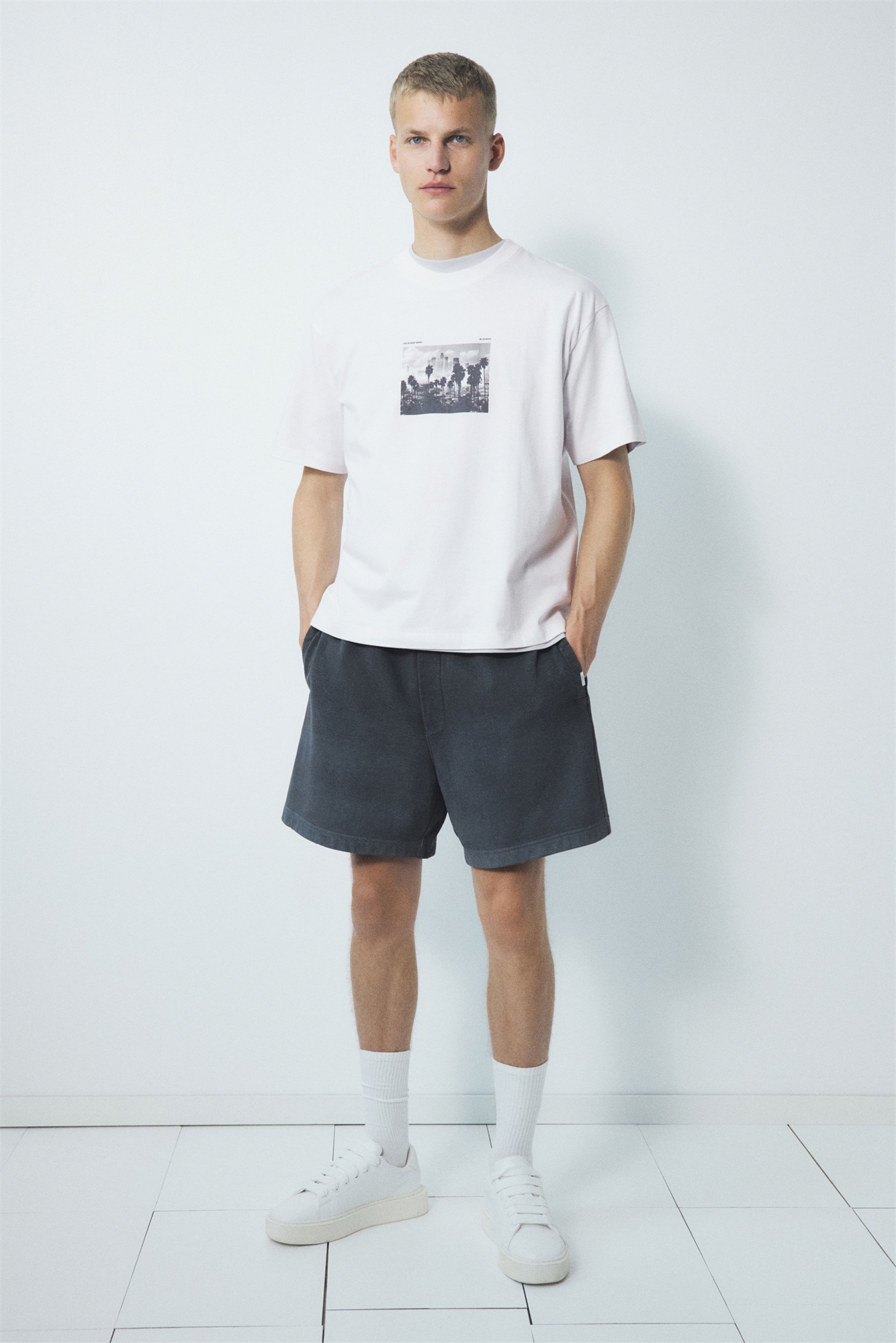 Футболка из хлопкового джерси средней плотности с принтом, круглым вырезом с ребристой отделкой, спущенными плечами и прямым покроем. Свободный крой для пышного, но не слишком большого силуэта.