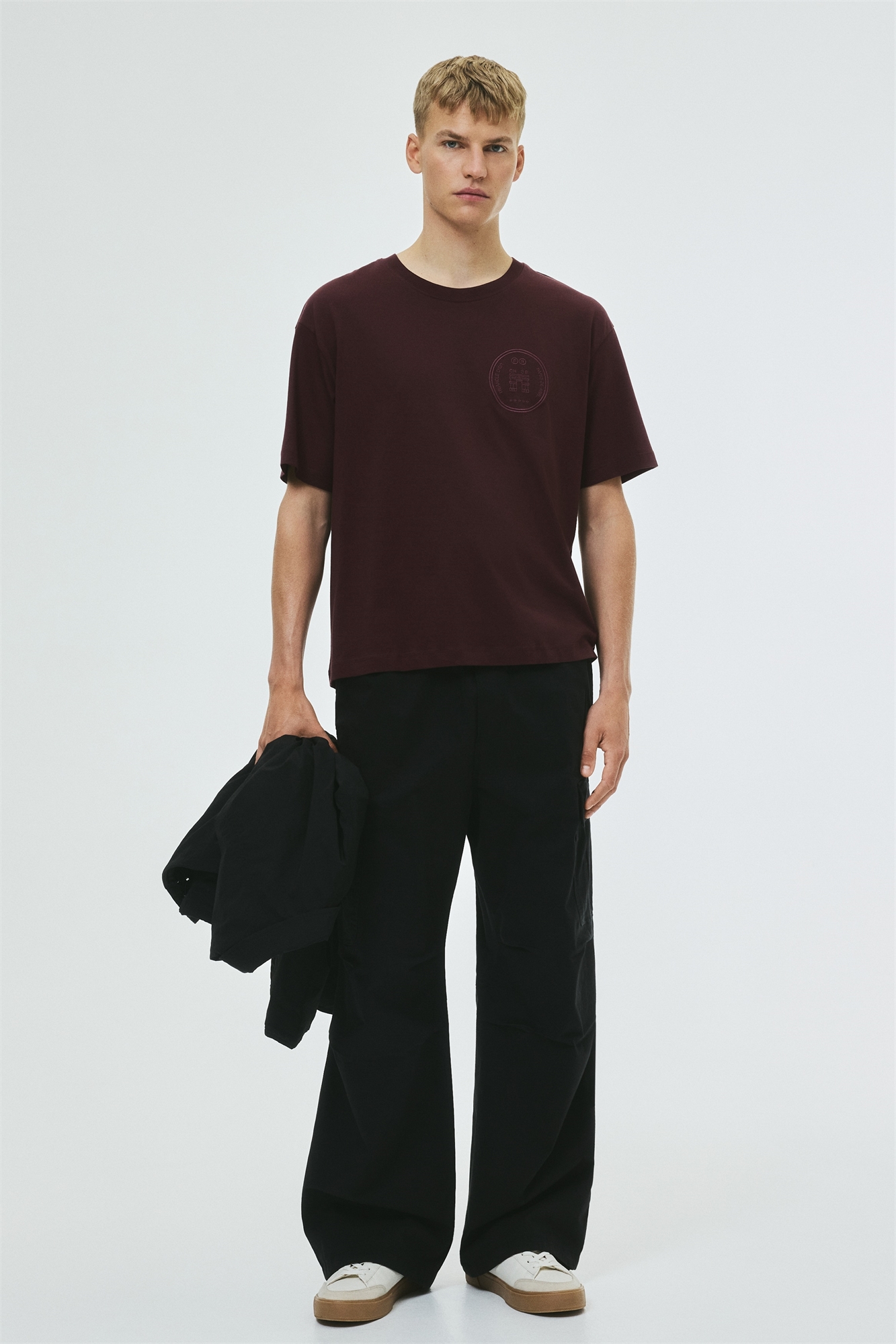 Футболка из хлопкового джерси средней плотности с принтом, круглым вырезом с ребристой отделкой, спущенными плечами и прямым покроем. Свободный крой для пышного, но не слишком большого силуэта.