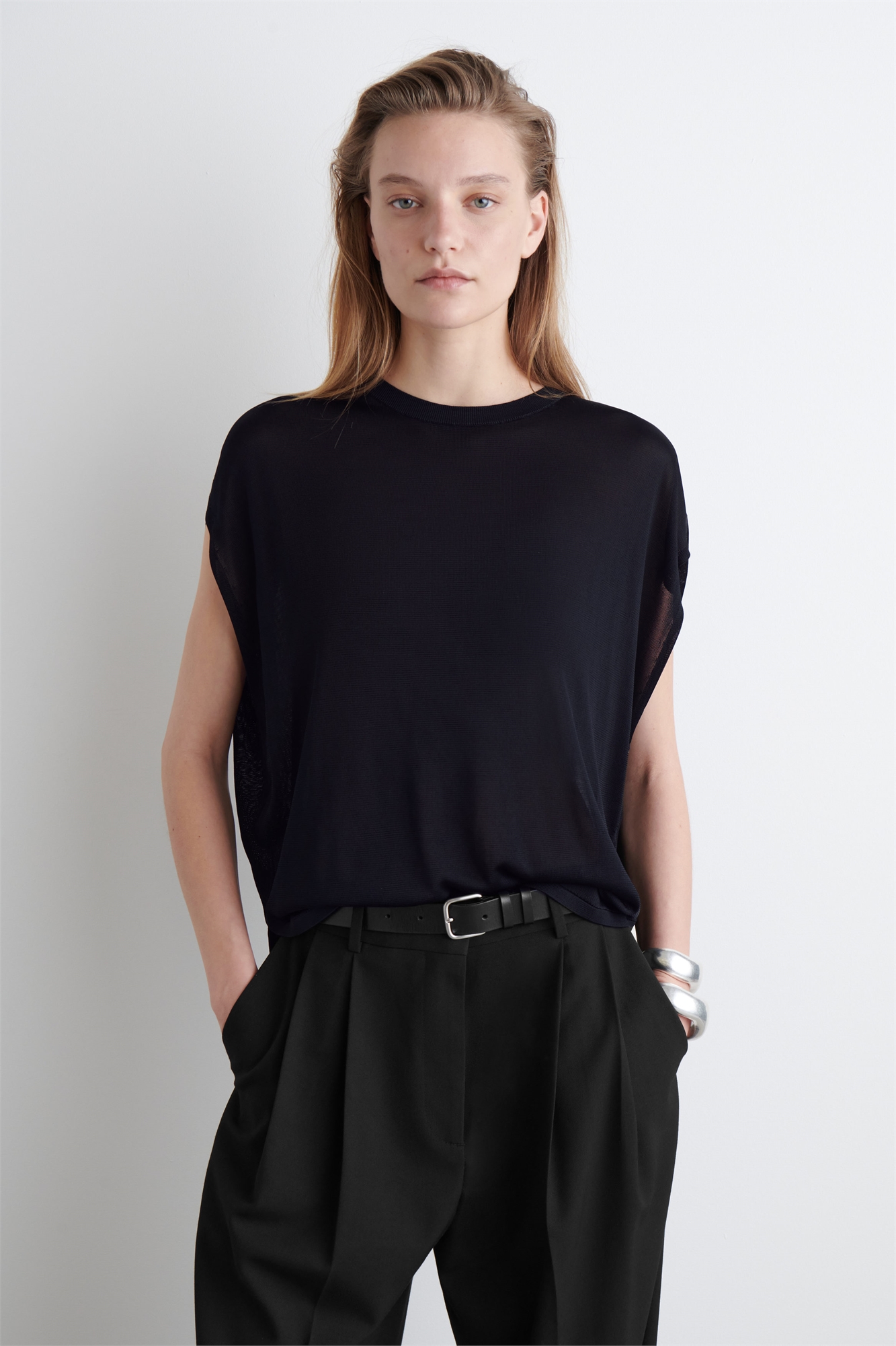 Эта трикотажная футболка кобальтово-синего цвета - современная интерпретация классической футболки. Она изготовлена из струящейся и слегка блестящей вискозы, имеет драпированные, обрезанные рукава и закругленный подол. Сочетайте ее с приталенным костюмом для создания элегантного вечернего наряда. Свободный крой Круглый вырез Внешняя ткань: 100% вискоза. Детали исключены/Машинная стирка Длина по спинке в размере S = 61 см/Модель носит размер S