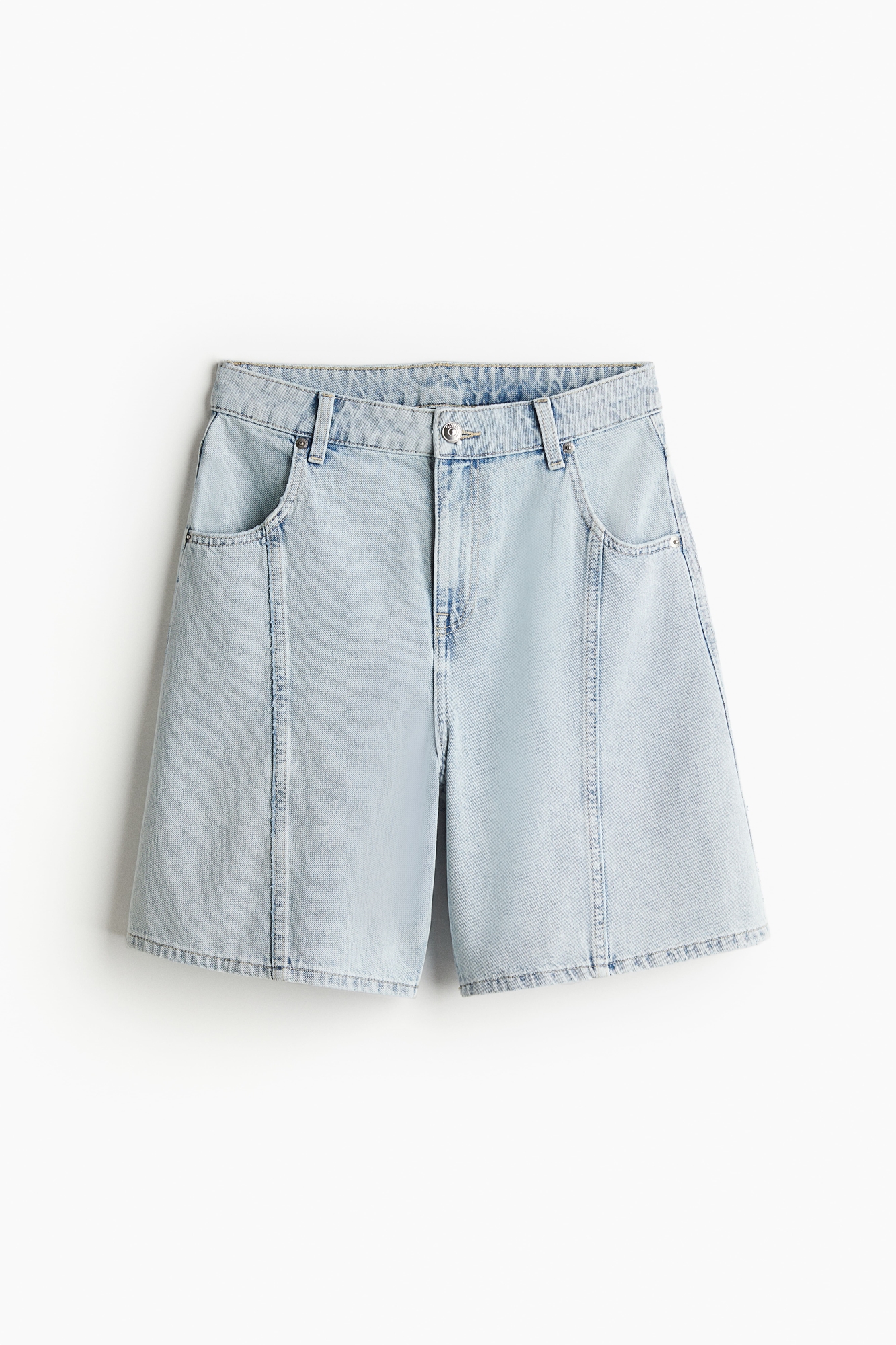Шорты длиной до колена из жесткого хлопкового денима, который сначала кажется упругим, но затем смягчается и ослабевает при носке. Высокая талия, застежка на молнию и пуговицу. Передние и задние карманы и видимые швы спереди.