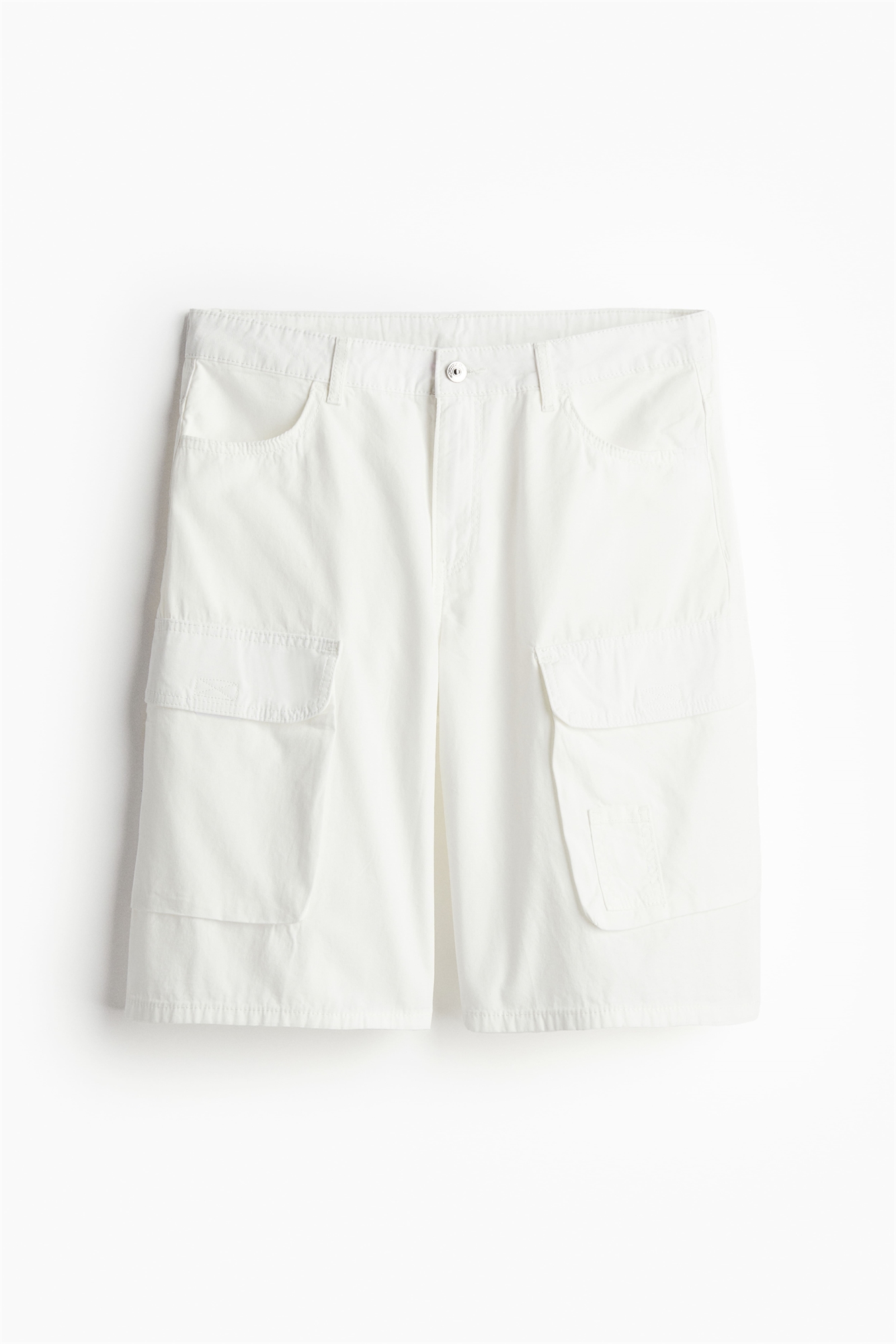 Шорты длиной до колена из хлопкового канваса с заниженной талией, ширинкой на молнии с пуговицей, передними и задними карманами. Карманы на ногах с клапаном и застежкой на крючок и петлю, один из которых с небольшим накладным карманом сверху.