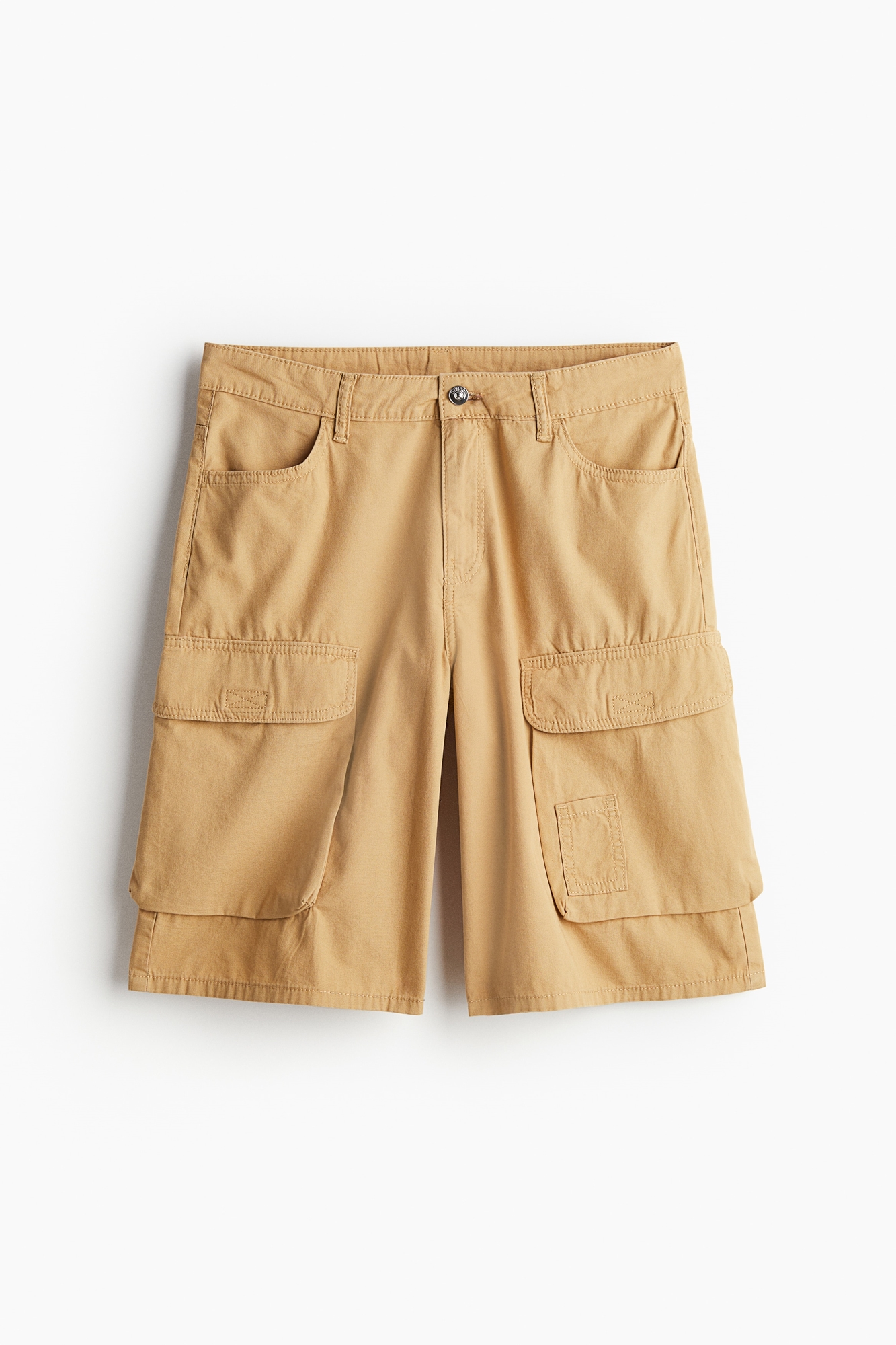 Шорты длиной до колена из хлопкового канваса с заниженной талией, ширинкой на молнии с пуговицей, передними и задними карманами. Карманы на ногах с клапаном и застежкой на крючок и петлю, один из которых с небольшим накладным карманом сверху.