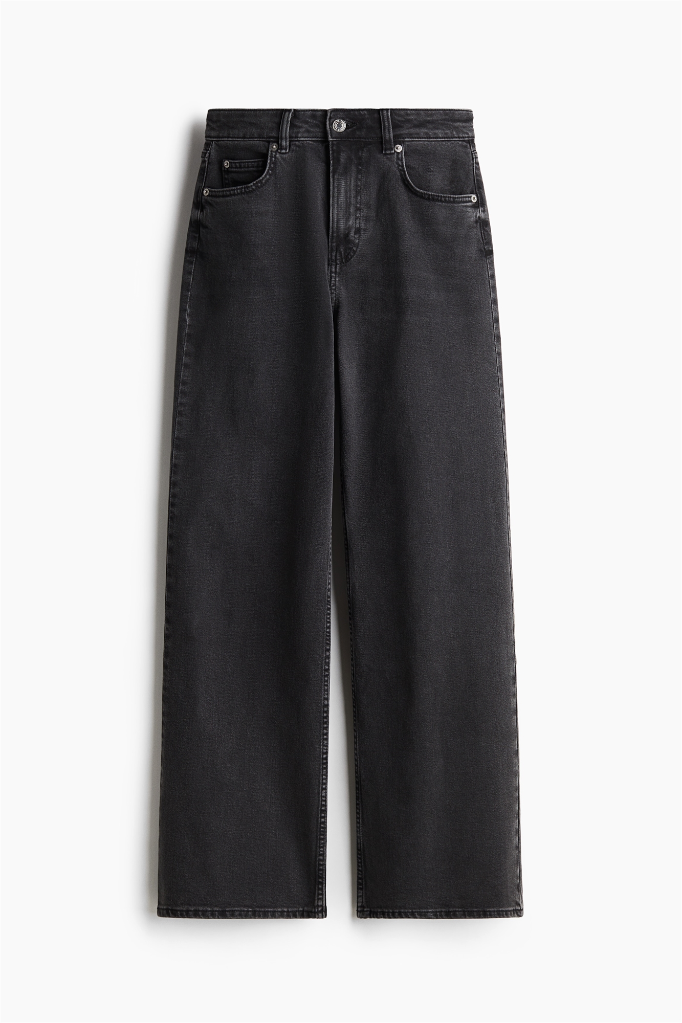 Джинсы с 5 карманами из слегка тянущегося денима с зауженной посадкой от талии до бедер и прямым, широким кроем от бедер до подола. Высокая талия, ширинка на молнии и пуговице.