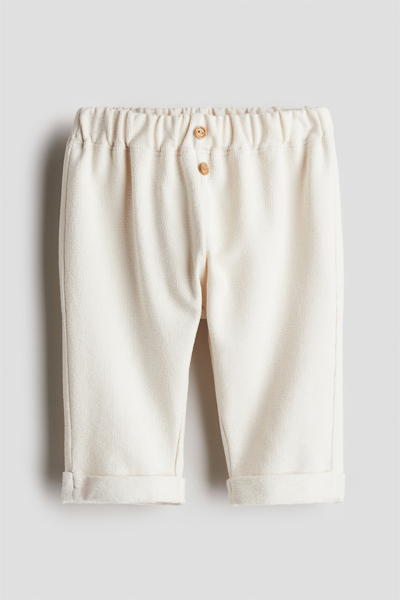 Джоггеры из мягкой хлопковой махры с утягивающим поясом со скрытой регулируемой резинкой для комфортной посадки в области живота и декоративными пуговицами под дерево спереди. Пришитые подвороты на подоле.