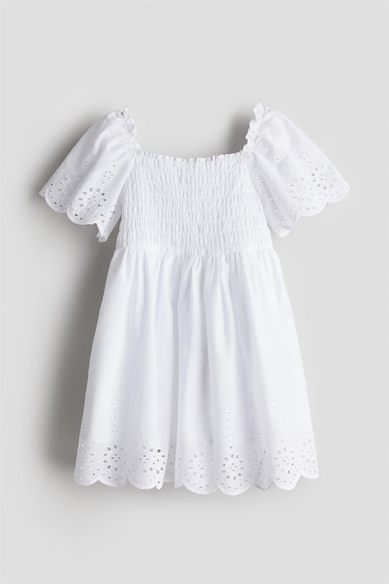 Платье из хлопчатобумажного полотна с отделкой бродери-англиз и гребешковыми краями. Квадратный вырез с оборками, платочная вставка спереди и пуговицы сзади. Узкая резинка на плечах и короткие рукава.