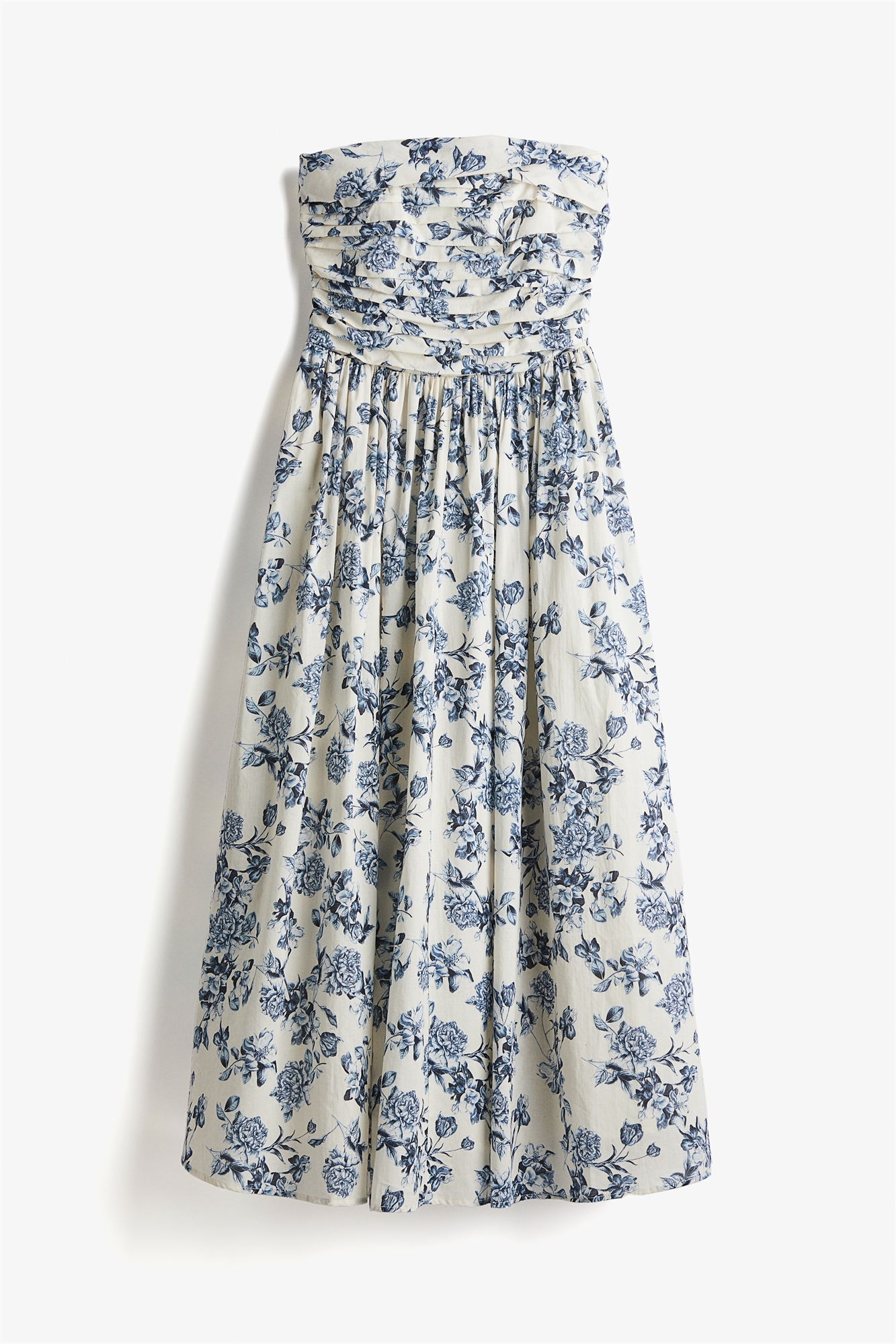 Платье длиной до колена из хрустящего хлопкового поплина с плиссированным лифом в корсетном стиле, скрытой силиконовой отделкой в верхней части и косточками для придания формы и поддержки. Скрытая застежка-молния с одной стороны и расклешенная юбка. На подкладке.