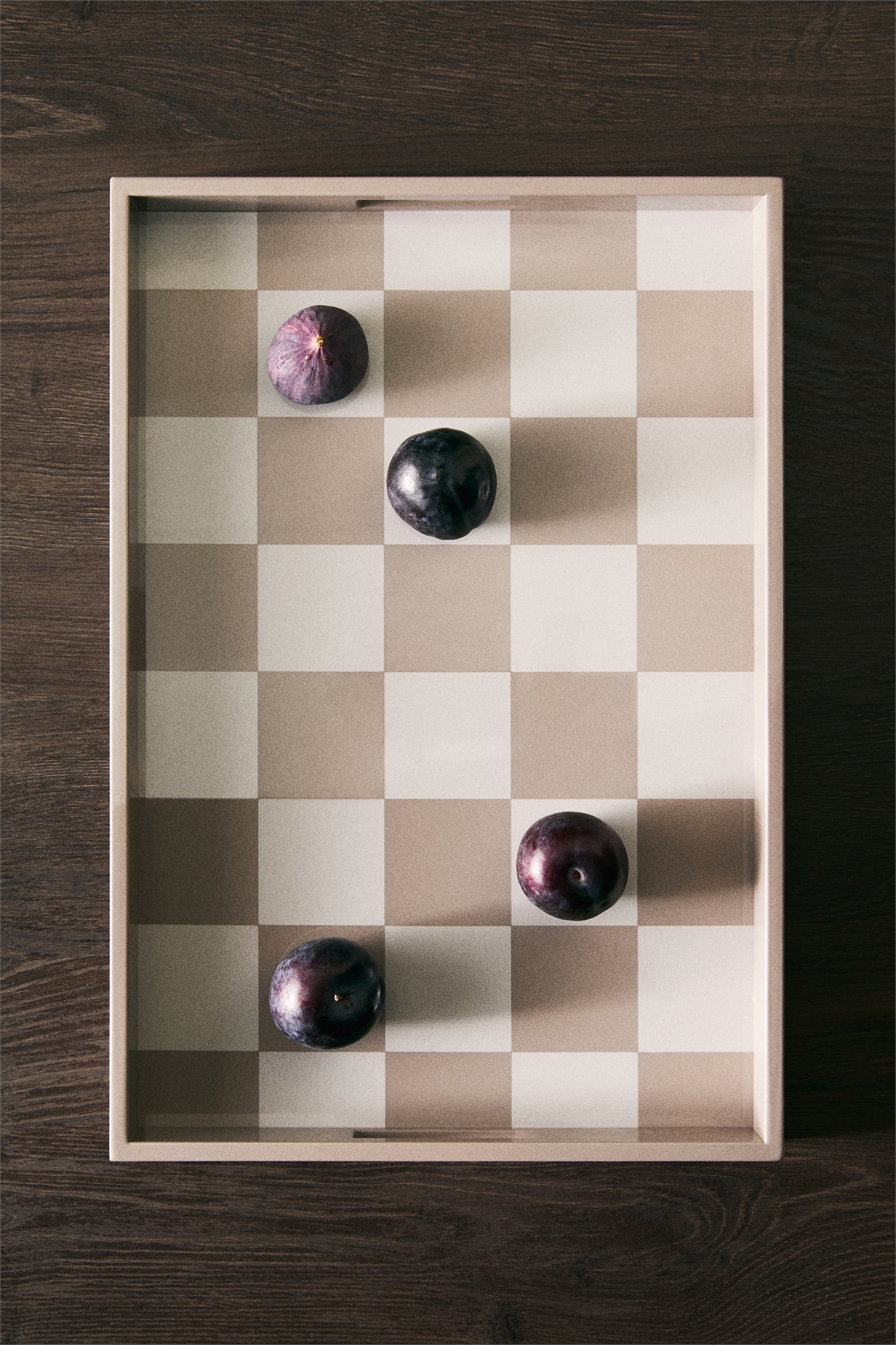 Прямоугольный поднос из лакированного МДФ с бортиком и ручками на коротких сторонах. Высота 4,4 см. Ширина 31 см. Длина 45 см.