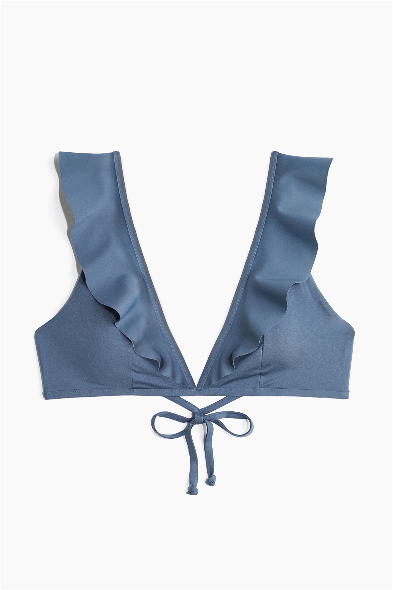 Бикини на подкладке, без проводов, с V-образным вырезом и оборкой, переходящей на плечи. Регулируемые бретели и чашечки со съемными вставками, придающими форму бюсту и обеспечивающими хорошую поддержку. Завязки сзади.