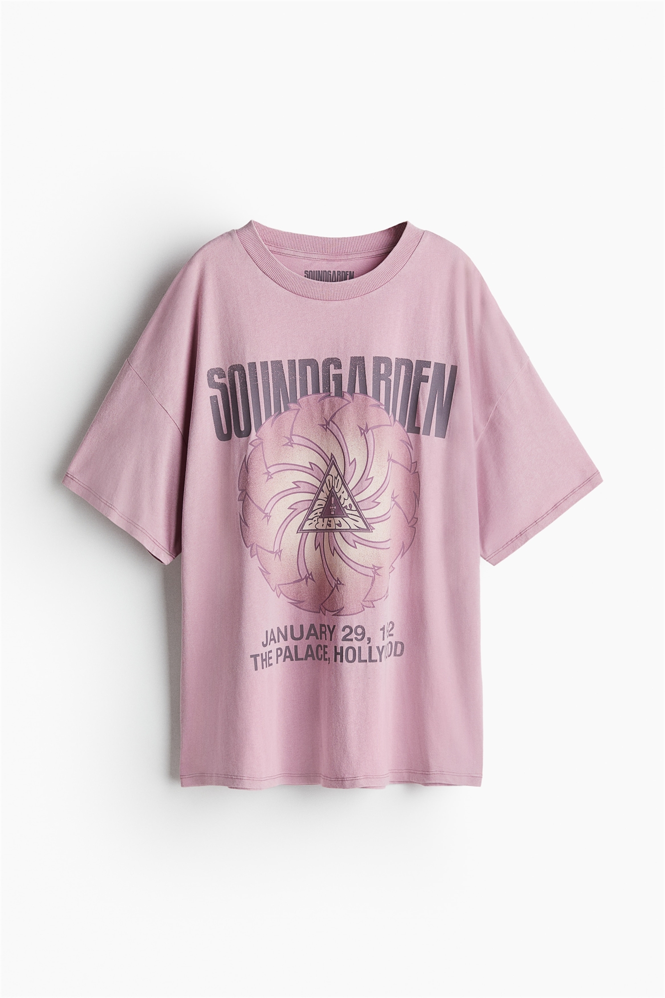 Футболка оверсайз из мягкого хлопкового джерси с принтом, ребристой отделкой по вырезу горловины, спущенными плечами и прямым покроем.