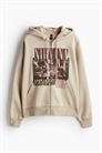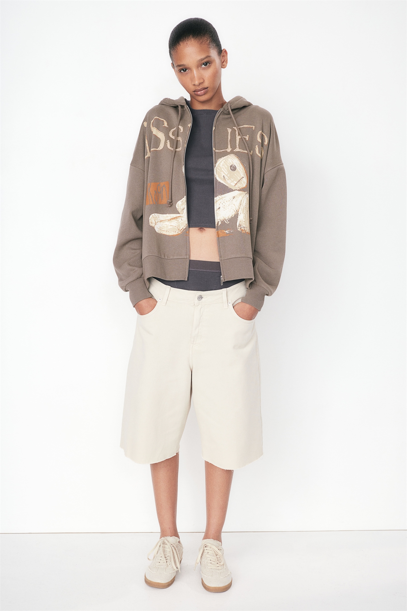 Толстовка на молнии с рисунком из толстовочной ткани с мягким начесом внутри. Силуэт оверсайз с двухслойным капюшоном на завязках, застежкой-молнией спереди, спущенными плечами и длинными рукавами. Манжеты и подол в рубчик.