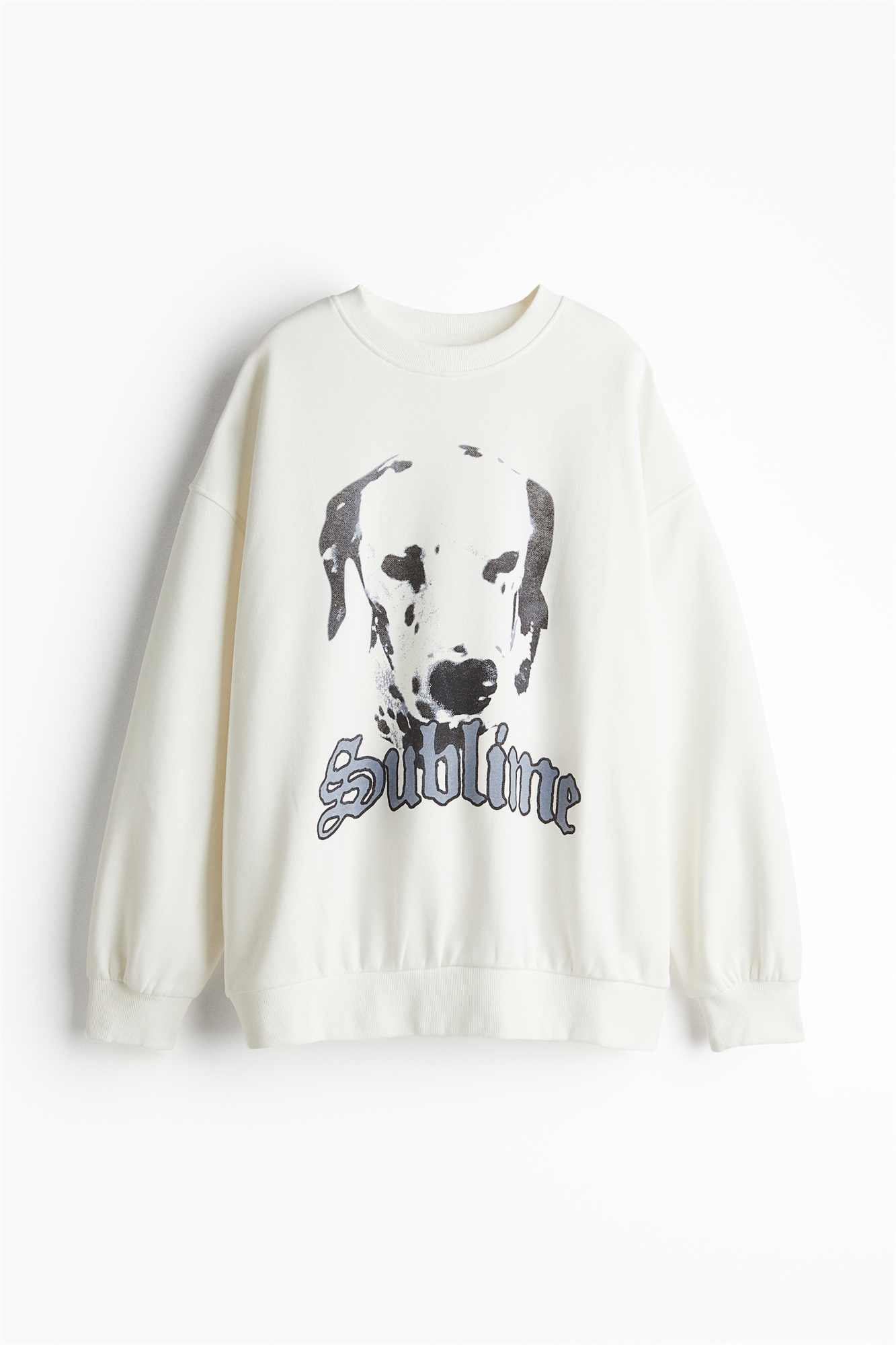 Топ оверсайз из принтованной толстовки с мягкой ворсистой внутренней стороной. Круглый вырез с ребристой отделкой, спущенные плечи и длинные рукава. Ребристые манжеты и подол.