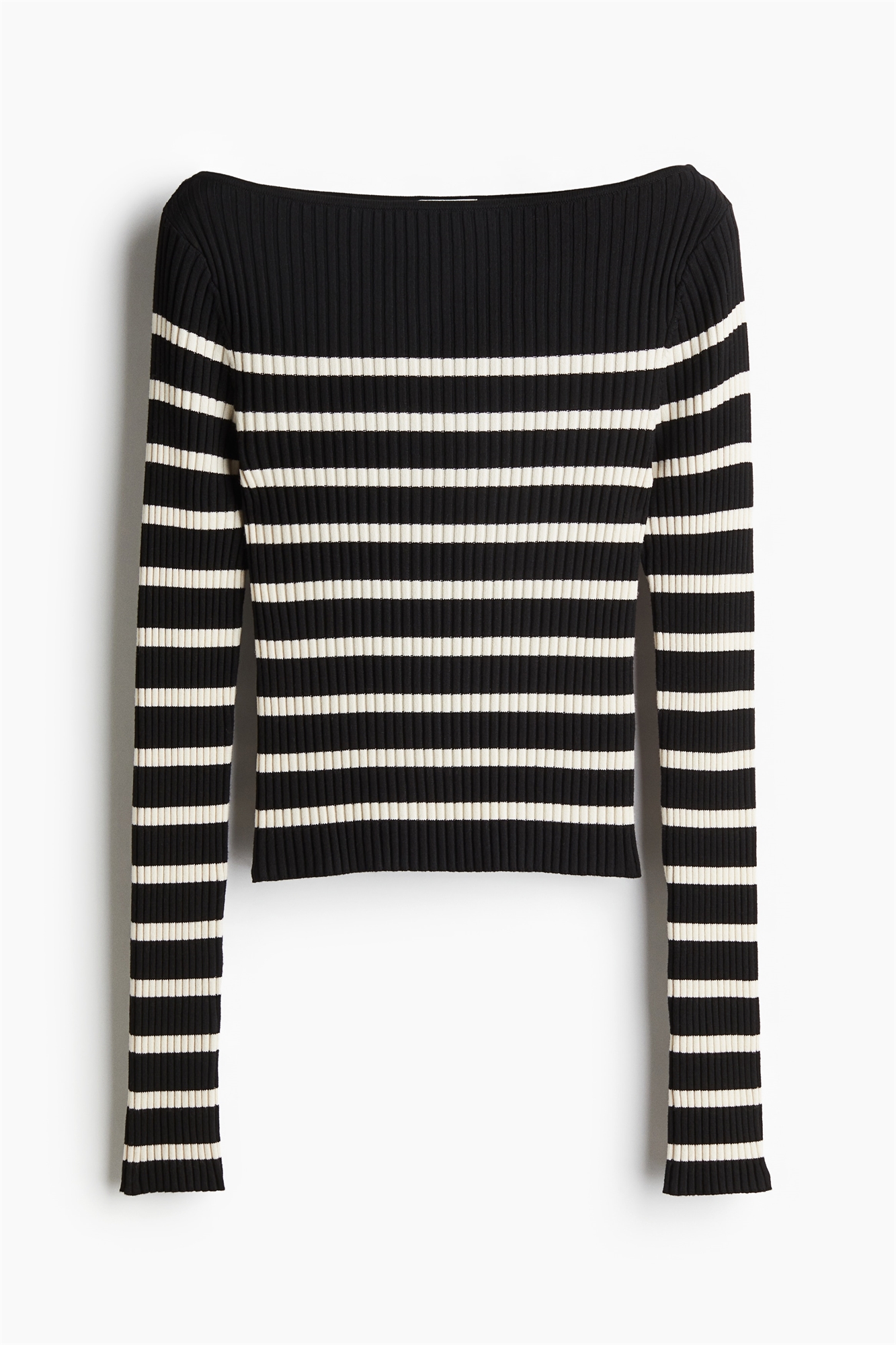Короткий приталенный топ из тонкого трикотажа в рубчик из смеси вискозы. Нежный вырез-лодочка с узкой окантовкой, длинные рукава с разрезом на манжетах и прямой подол.