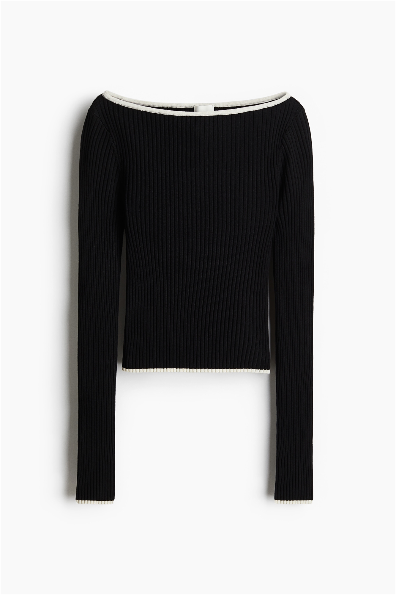 Короткий приталенный топ из тонкого трикотажа в рубчик из смеси вискозы. Нежный вырез-лодочка с узкой окантовкой, длинные рукава с разрезом на манжетах и прямой подол.