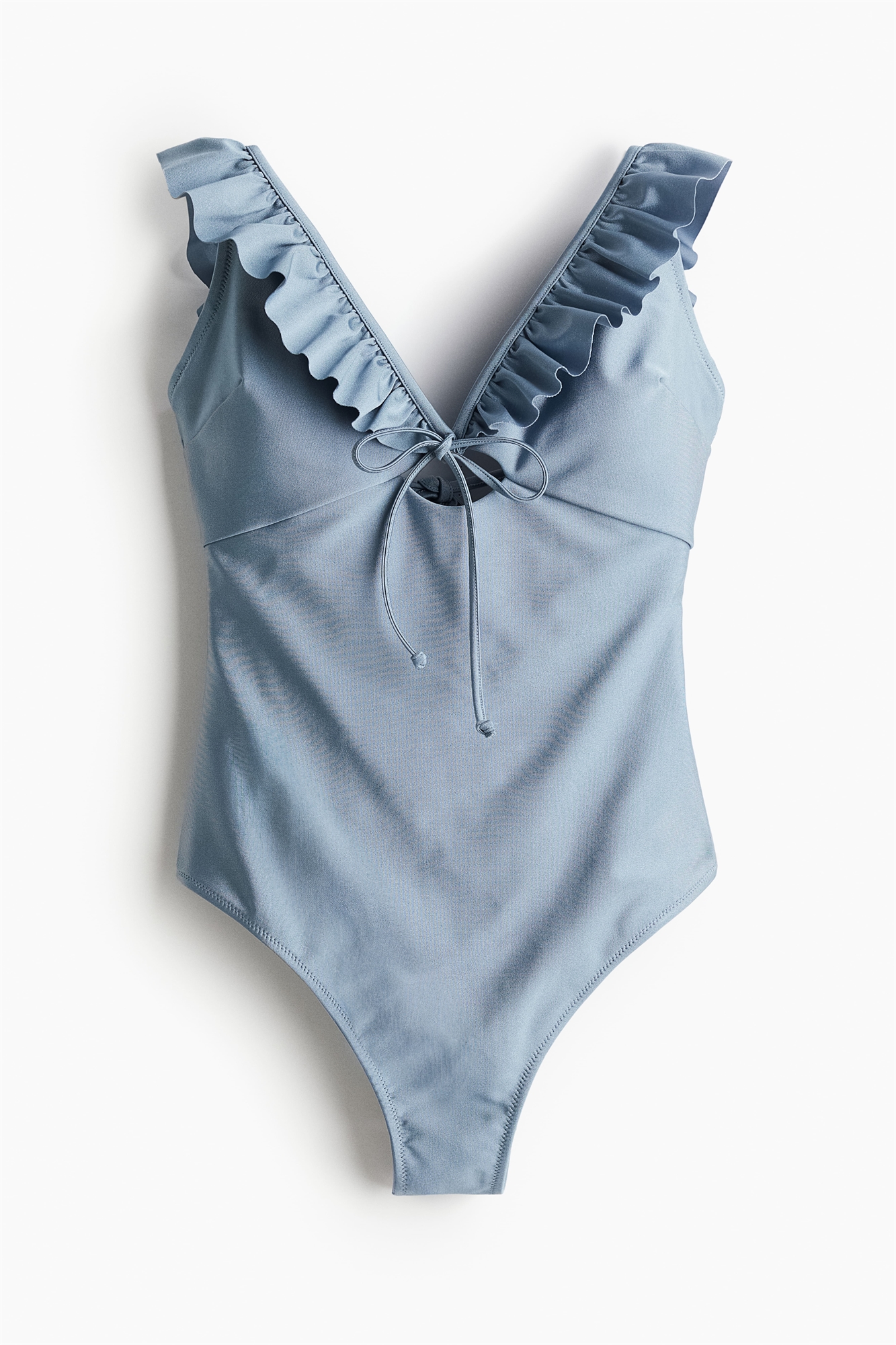 Полностью закрытый купальник с V-образным вырезом горловины с оборкой, переходящей на плечи. Небольшой вырез с узкими завязками по центру бюста и регулируемые бретели, завязывающиеся сзади. Чашечки со съемными вставками, придающими форму бюсту и обеспечивающими хорошую поддержку. Средняя посадка сзади.