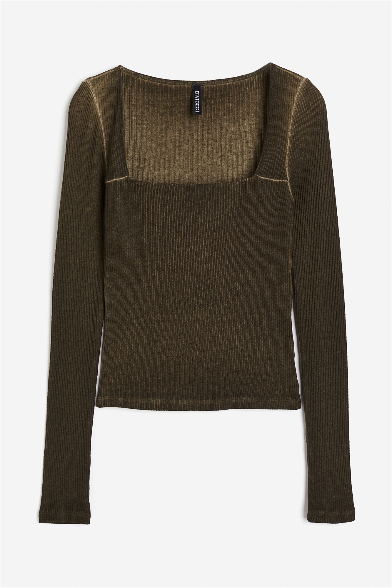 Облегающий топ из ребристого трикотажа с потертым видом. Квадратный вырез, длинные рукава и прямой подол.