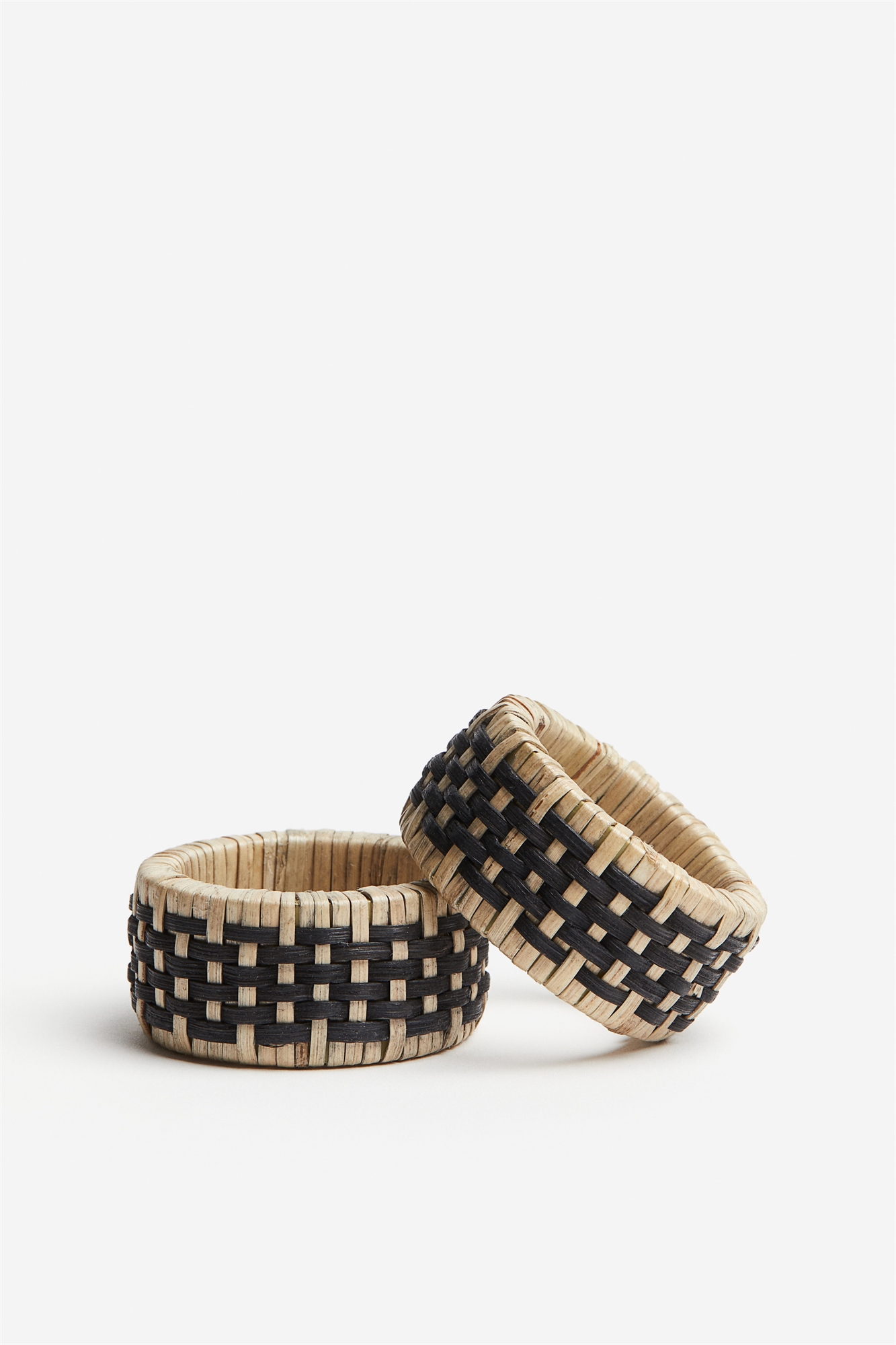 Набор колец для салфеток из ротангового плетения с нитями основы и утка в акцентных цветах. Ширина 3 см. Диаметр 4,3 см.