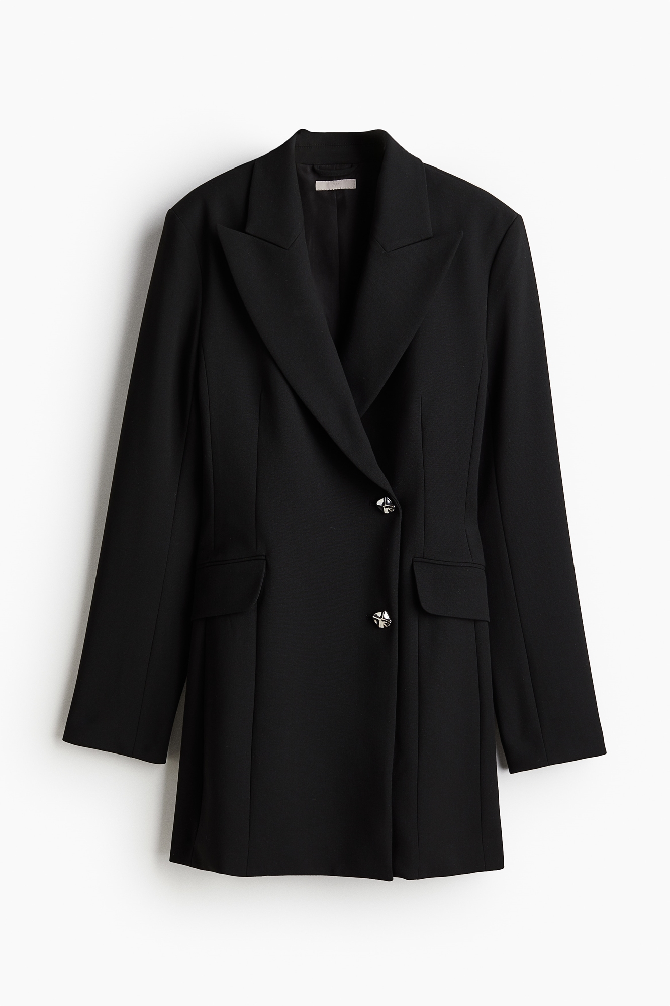 Короткое приталенное платье-блейзер из тканого материала с пикообразными лацканами, подплечниками, длинными рукавами и втачными карманами с клапаном. Две видимые металлические пуговицы и две потайные пуговицы спереди. На подкладке.
