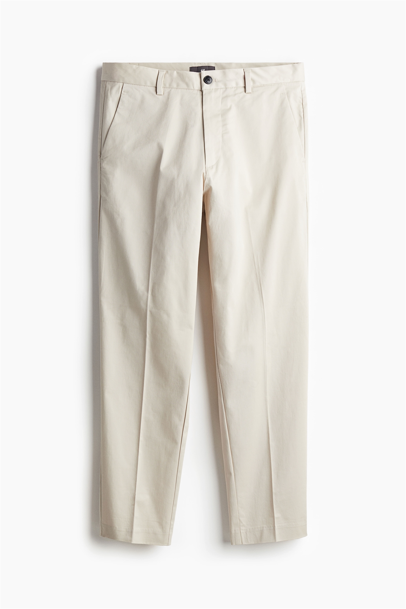 Брюки длиной до щиколотки из мягкого хлопкового полотна с ширинкой на молнии и пуговице, диагональными боковыми карманами, втачными задними карманами на пуговице и складками спереди и сзади. Зауженный крой, облегающий контуры тела и создающий приталенный силуэт.