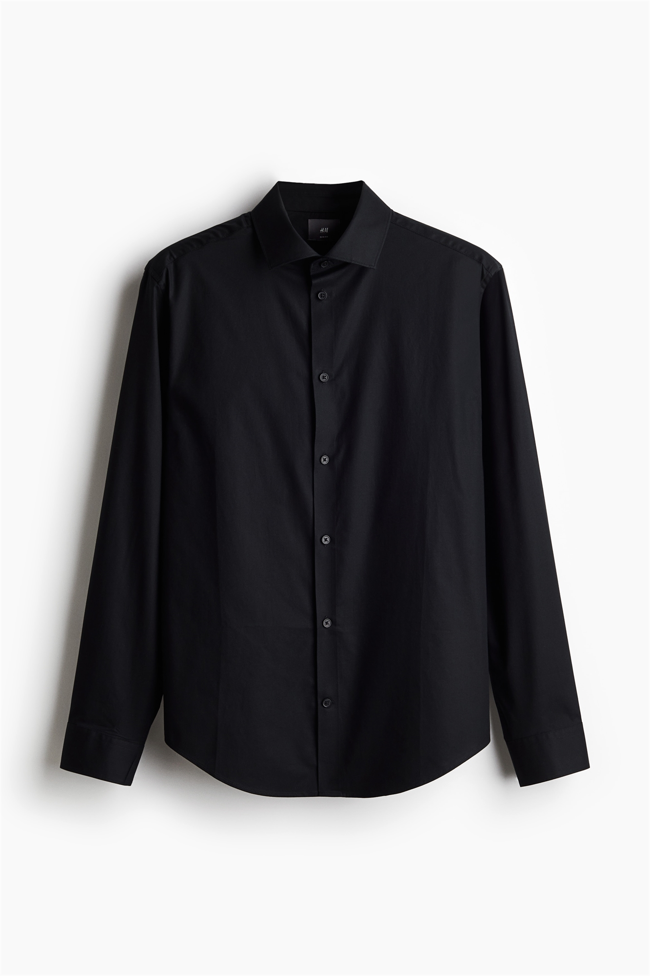 Рубашка из хлопкового полотна с отложным воротником, классической передней частью и передом. Длинные рукава с регулируемыми пуговицами на манжетах и рукавной планкой с пуговицей. Аккуратный закругленный подол. Зауженный крой, облегающий контуры тела и создающий приталенный силуэт.