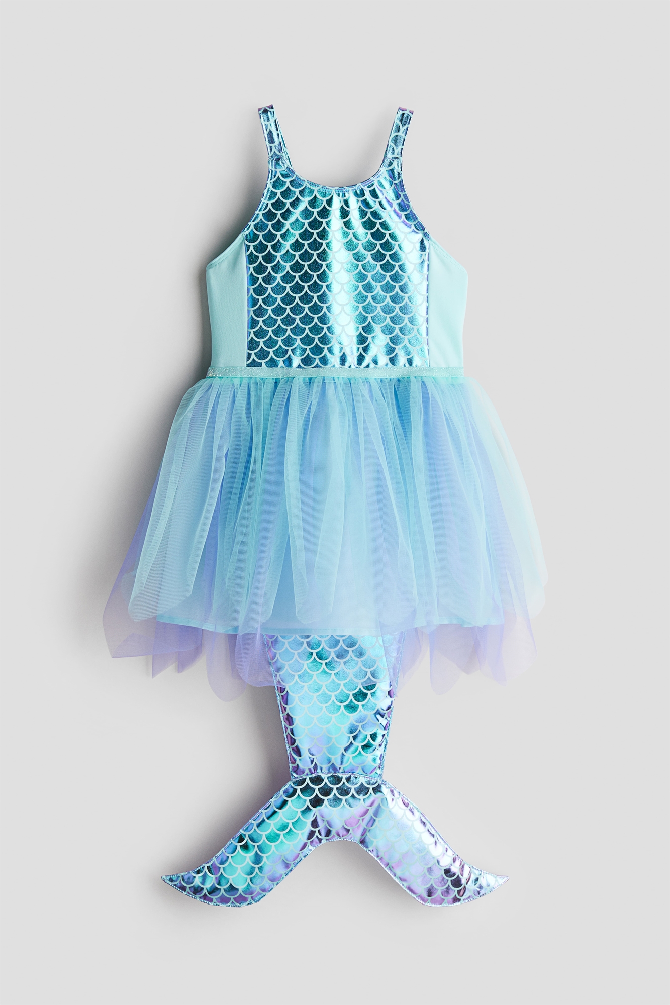 Маскарадный костюм без рукавов из трикотажа с металлическим отливом, с эластичной отделкой на талии и расклешенной юбкой с двойным слоем фатина сверху. Съемный мягкий хвост с принтом и застежкой на крючки и петли. Частично на подкладке. Этот костюм создан для долгого использования и любви - заботьтесь о нем, передавайте его по наследству, ремонтируйте и перерабатывайте.