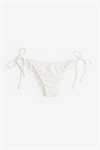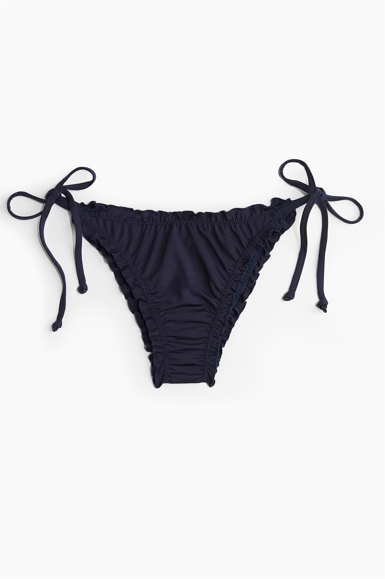 Трусы-бикини на подкладке с оверлочными краями. Заниженная талия, завязки по бокам, сборчатый шов на попе и высокий разрез сзади.