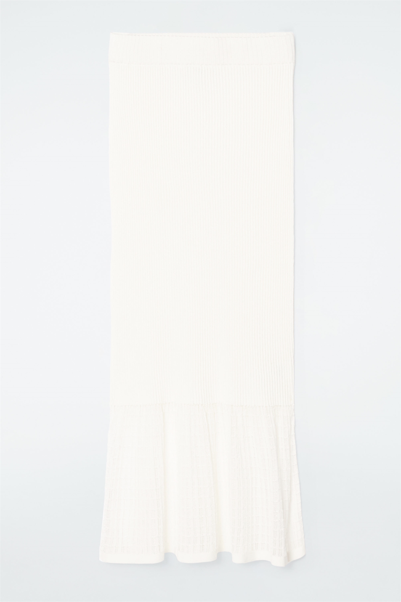 Эта юбка-миди из ребристого трикотажа в оттенке слоновой кости - тонкая интерпретация тренда на прозрачность. Облегающий фасон прилегает к телу и имеет расклешенный подол с кружевным и лестничным узором. Дополните комплект соответствующим бюстгальтером и кардиганом. Зауженный крой Эластичный пояс Благодаря использованию переработанного нейлона мы снижаем потребность в ограниченных природных ресурсах и сокращаем выбросы парниковых газов Материал верха: 71% экожилин, 16% переработанный полиамид (переработанный нейлон), 13% переработанный полиэстер. Материал низа: 100 % переработанный полиамид (переработанный нейлон). Детали исключены/Машинная стирка Длина по спинке в размере S = 88 см/Модель носит размер S