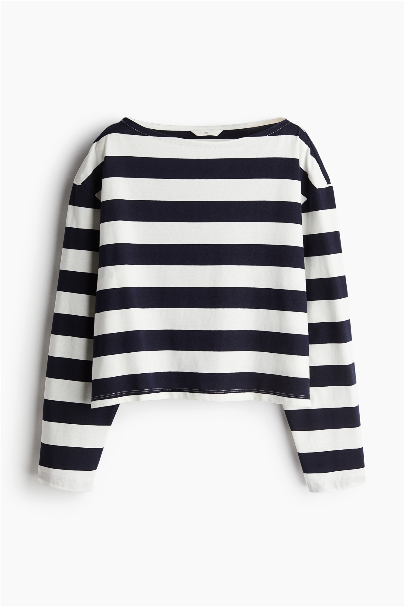 Топ оверсайз из мягкого хлопкового джерси с вырезом-лодочкой, спущенными плечами и длинными рукавами.