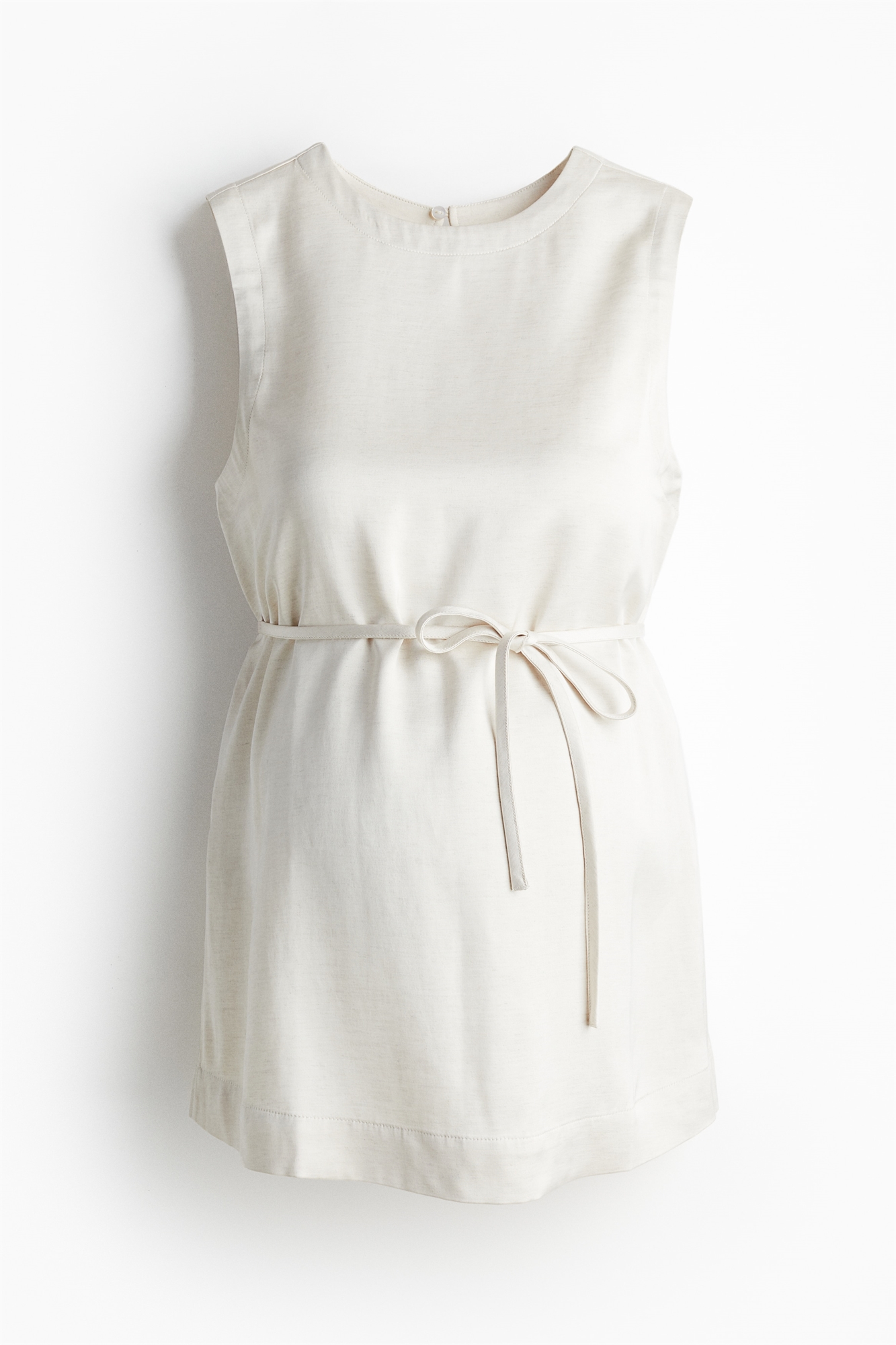 Блузка без рукавов из тканого материала с круглым вырезом, прорезью для ключа с потайной пуговицей сзади и узким съемным поясом-завязкой под бюстом. Подол прямого покроя с разрезом с каждой стороны.