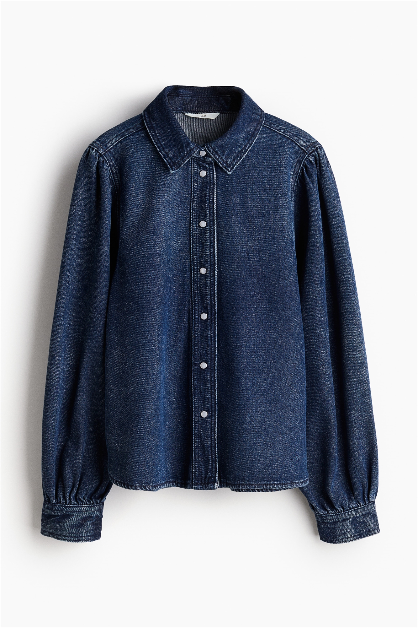 Джинсовая блузка из смеси лиоцелла и хлопка. С воротником, шпильками спереди и сзади. Длинные рукава-баллоны с шипами на манжетах и слегка закругленный подол.
