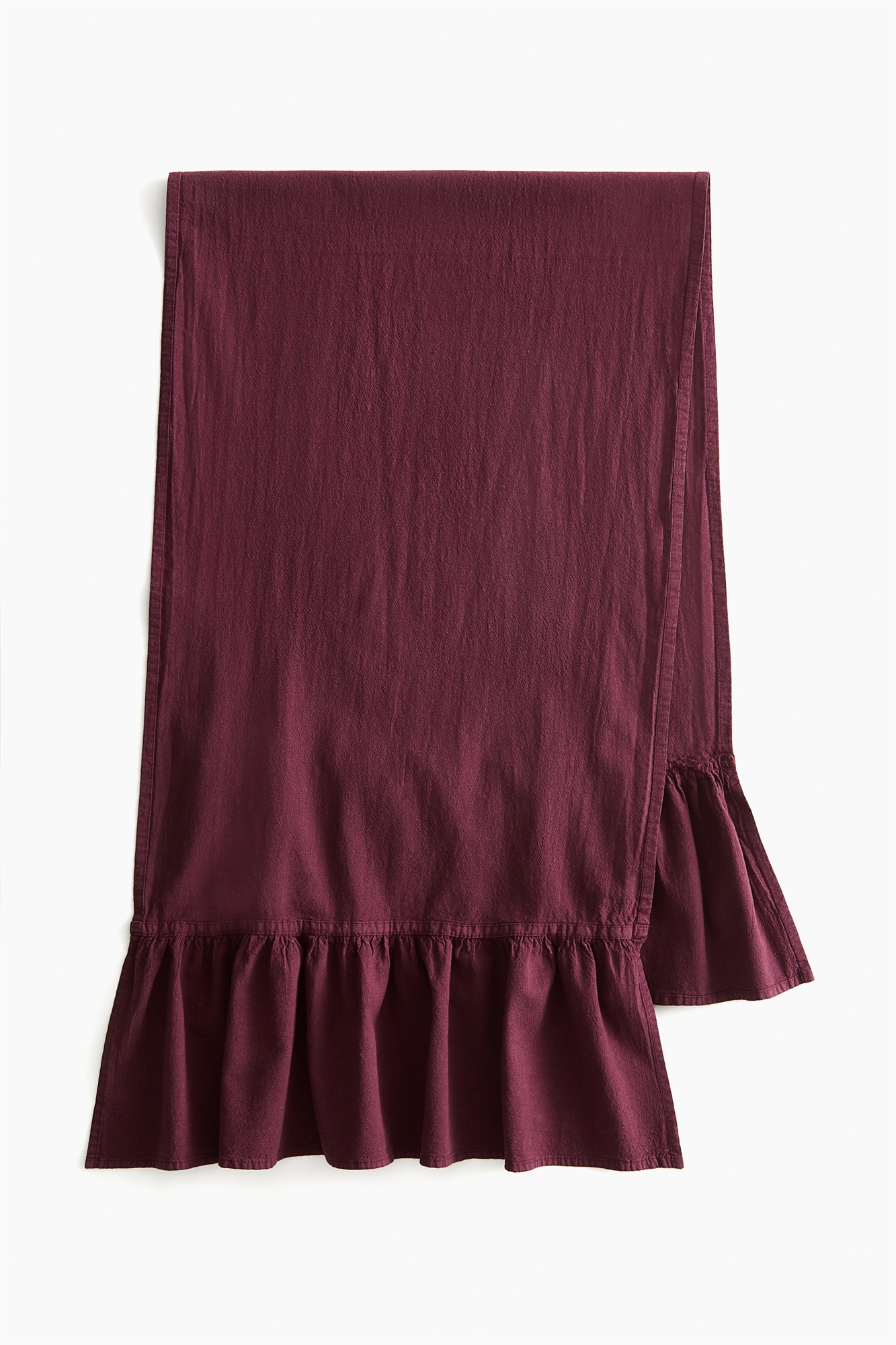 Настольная дорожка из льна и хлопка с полосами из гармоничного сочетания натуральных цветов и оборками по коротким сторонам.