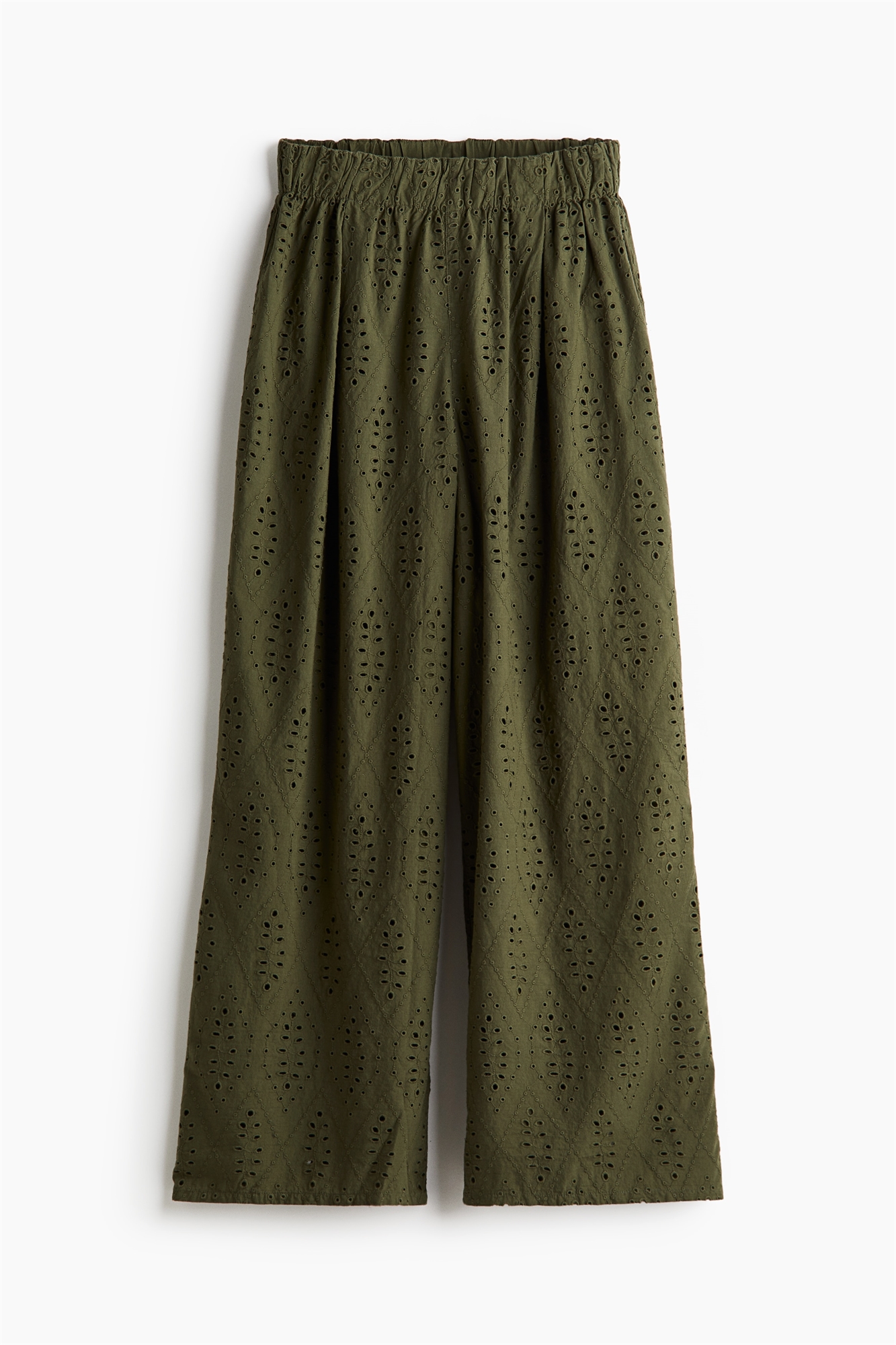 Свободные брюки из хлопка с переплетением нитей, украшенные английской бродери. Завышенная талия с утяжкой, накладные задние карманы и широкие ноги. Без подкладки.