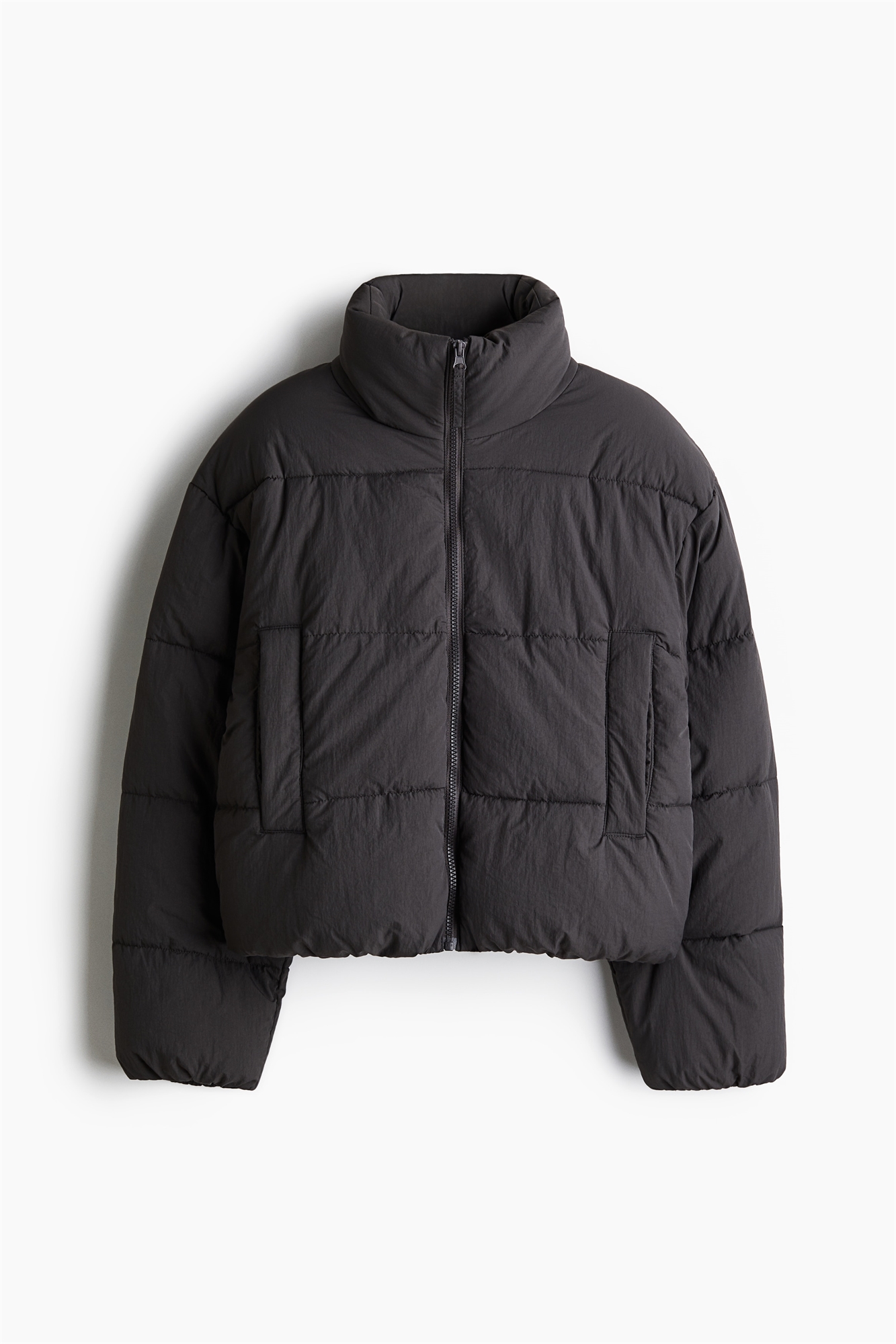Короткий пуховик из стеганого полотна с воротником-стойкой и застежкой-молнией спереди. Накладные карманы спереди и скрытая эластичная резинка на манжетах и подоле. На подкладке.