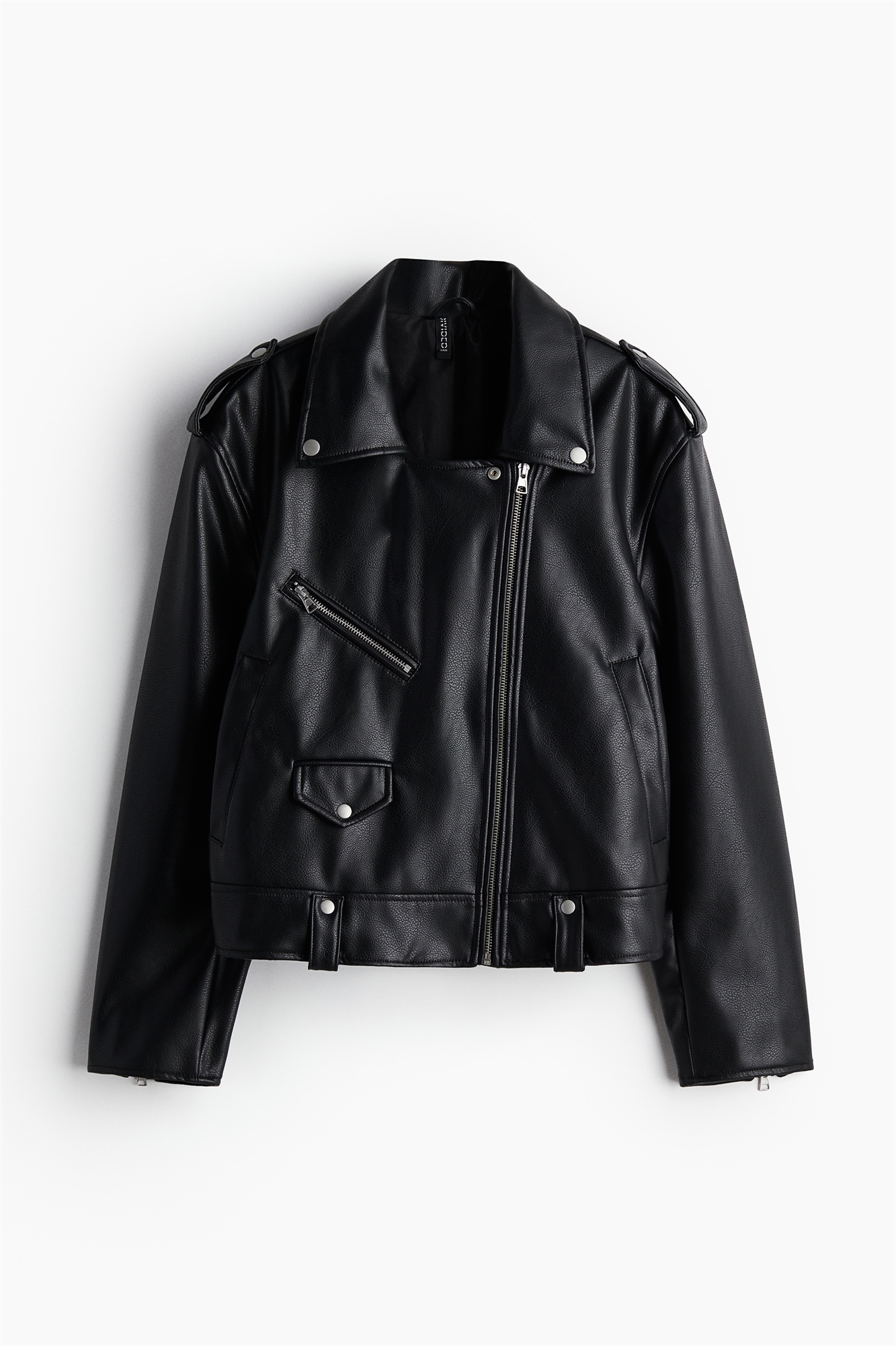 Байкерская куртка из ткани с покрытием с вырезными лацканами с декоративными кнопками и диагональной застежкой-молнией спереди. Плечевые вставки с прижимной планкой и длинные рукава с застежкой-молнией на манжетах. Нагрудный карман на молнии, прорезные боковые карманы и накладной карман на молнии спереди. Петли для ремня и декоративная застежка на подоле. На подкладке.