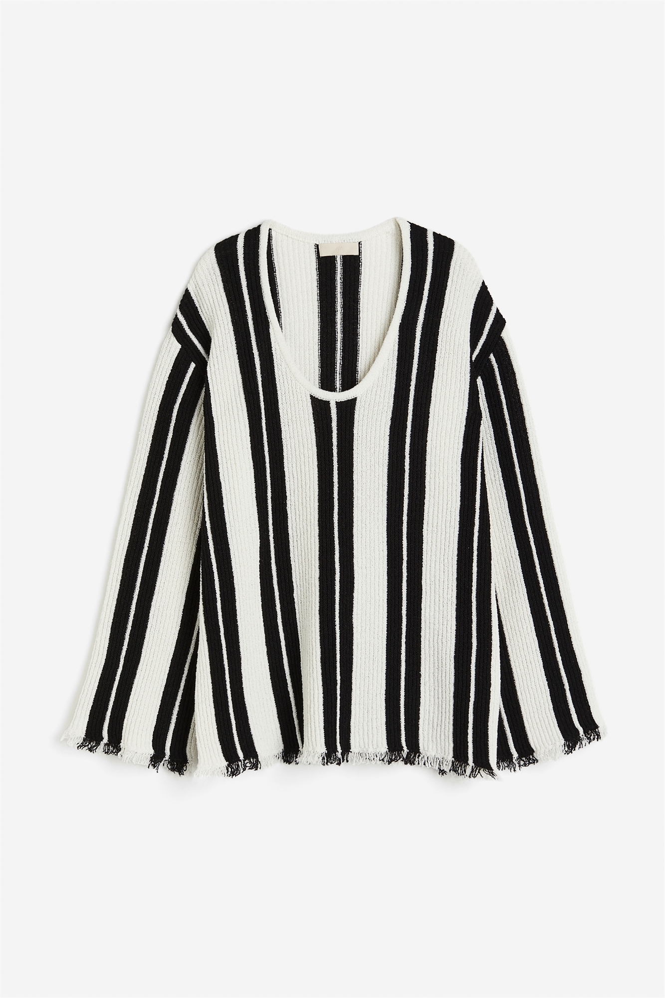 Джемпер оверсайз из хлопкового микса с вырезом-лодочкой, спущенными плечами и длинными рукавами. Обтрепанные края манжет и подола.