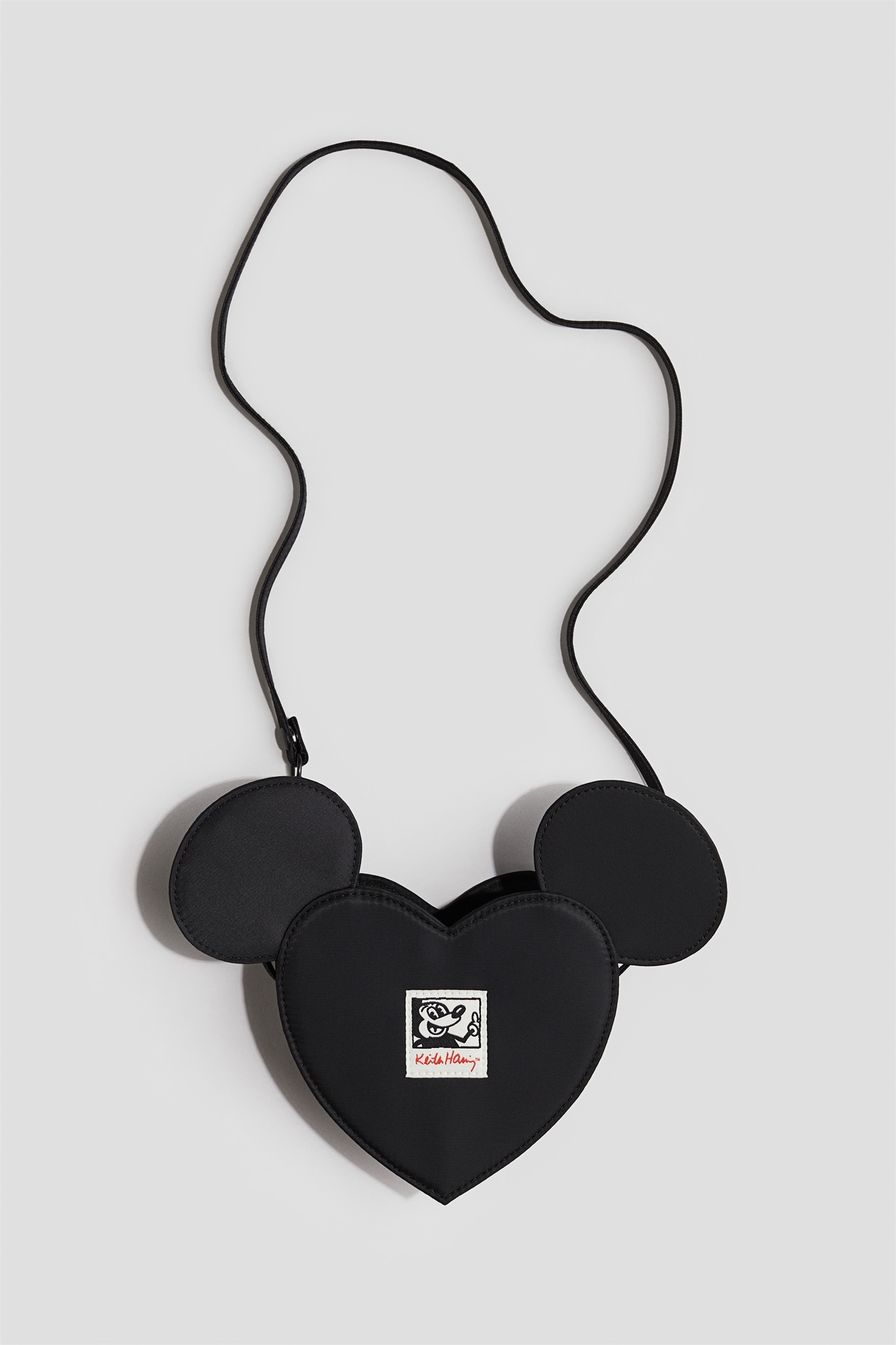 Disney x Keith Haring. Сумка через плечо в форме сердца из стираной хлопковой саржи с аппликациями в виде известных ушей и небольшой нашивкой спереди. Застежка-молния сверху и узкий плечевой ремень с застежкой на кнопке с одного конца. Подкладка из тафты. Глубина 4 см. Высота 13 см. Ширина 14 см.