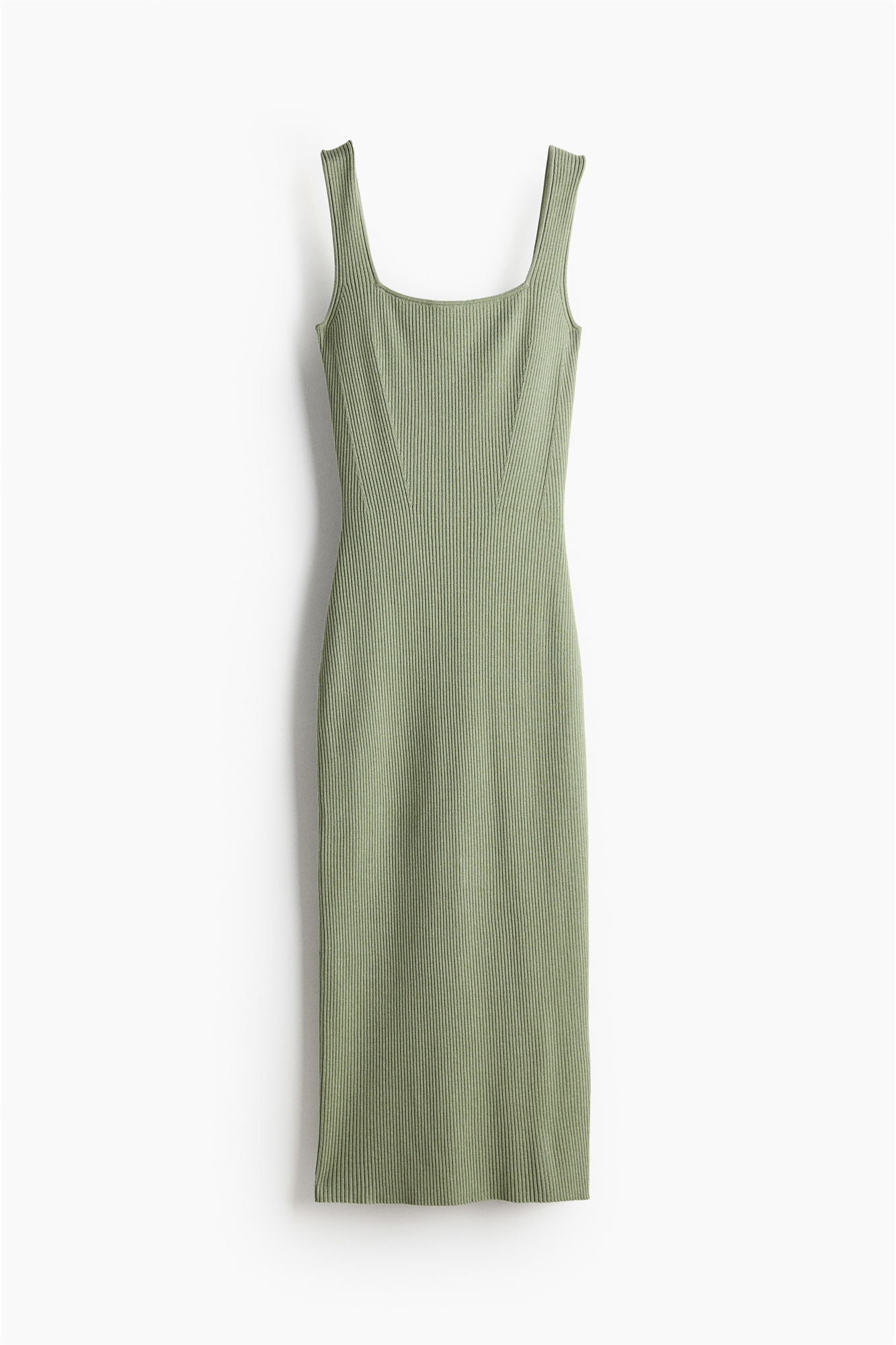 Приталенное платье длиной до колен из трикотажа в рубчик с широкими бретелями и квадратным вырезом спереди и сзади.