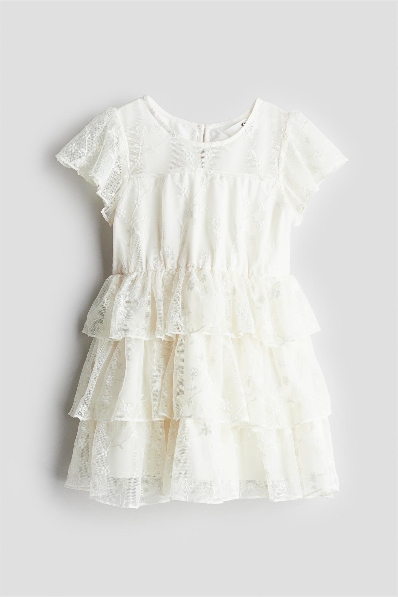 Платье из узорчатого шифона с круглым вырезом, отделанным оборками, отверстием для ключа с пуговицей сзади, рукавами-бабочками и узкой резинкой на талии. Объемная юбка с многослойными воланами.