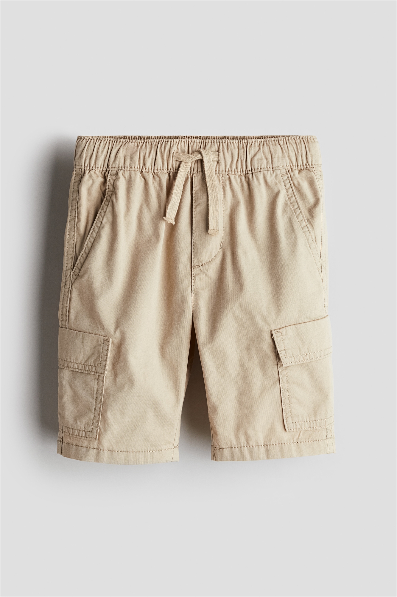 Шорты-карго длиной до колена из хлопковой саржи. Свободный крой, эластичный пояс с завязками, фальшивая ширинка, диагональные боковые карманы и карманы на ногах с клапаном.