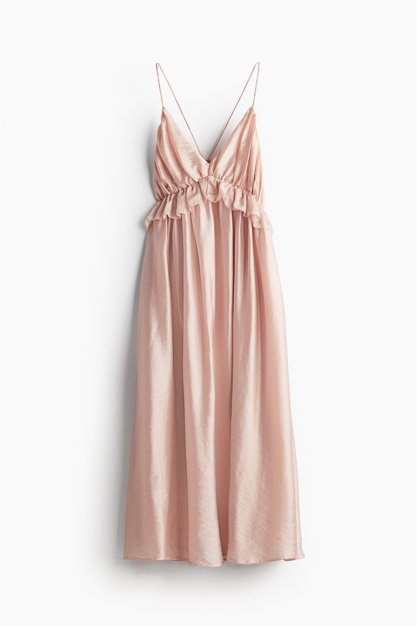 Платье длиной до колен из тканого материала с глубоким V-образным вырезом и бретелями-спагетти, которые перекрещиваются, продеваются через небольшие петли и завязываются сзади. Отделка в виде оборок под бюстом, потайная застежка-молния с одной стороны и расклешенная юбка. На подкладке.
